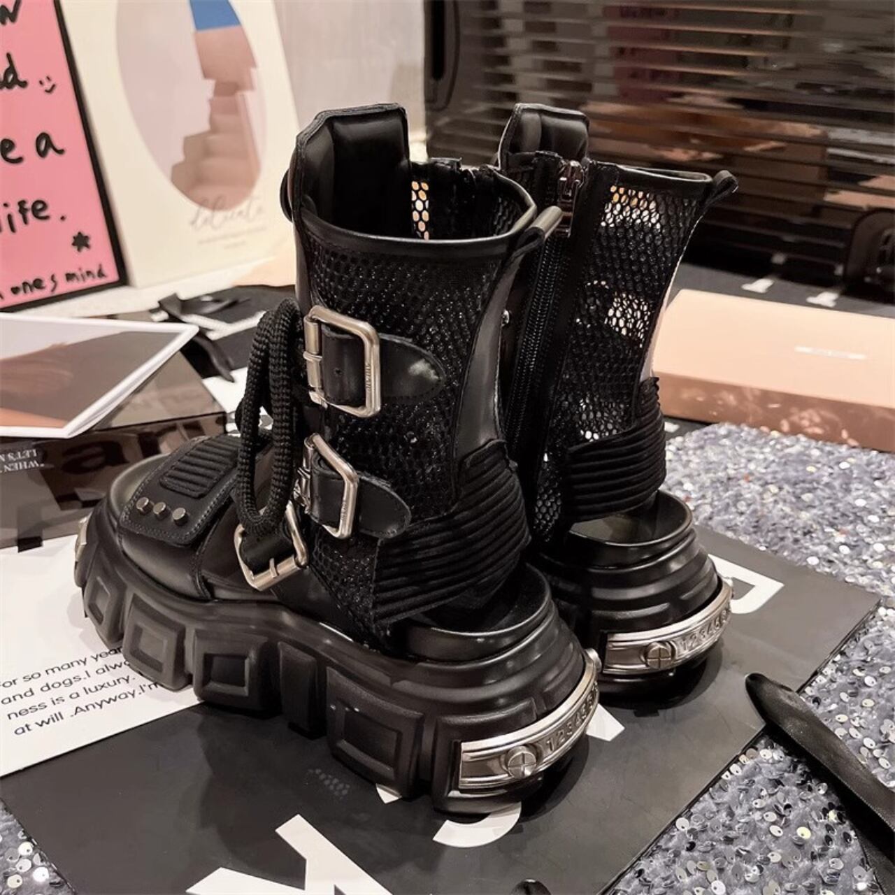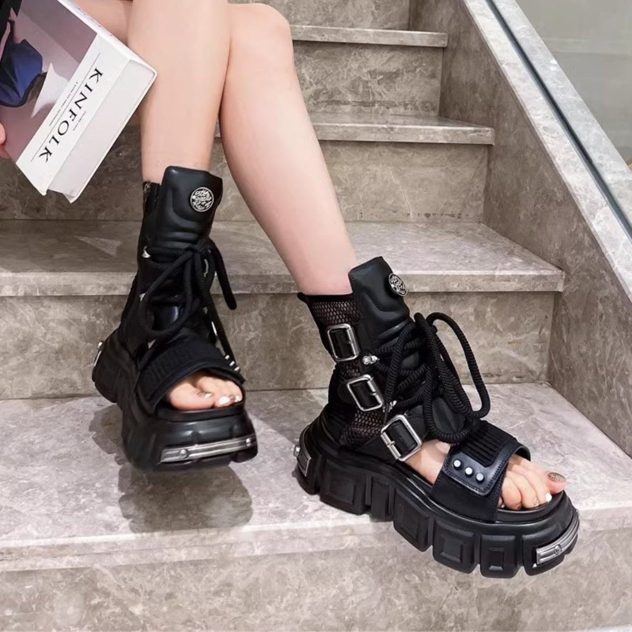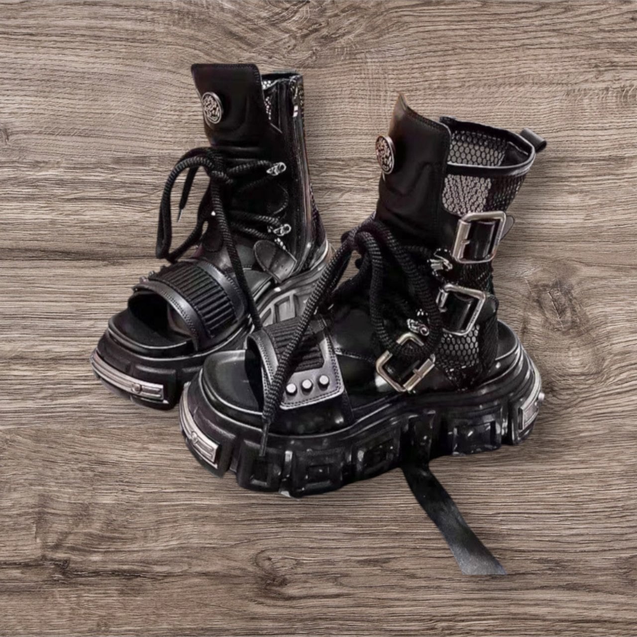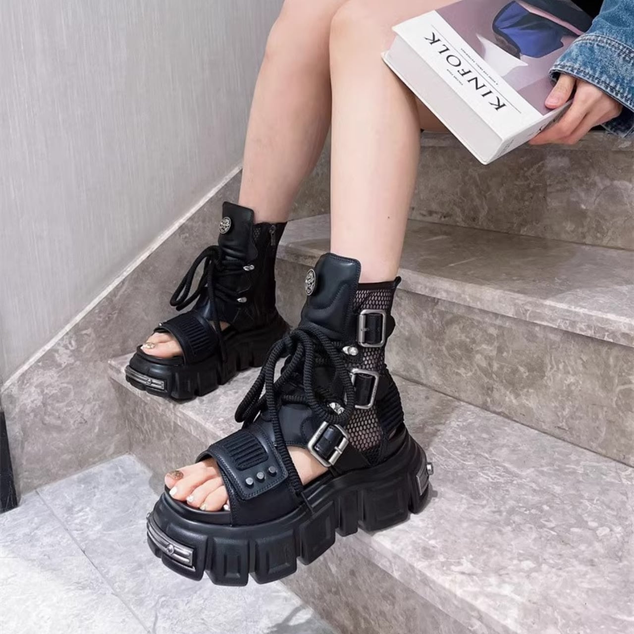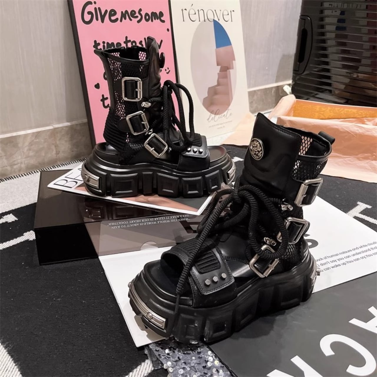 メッシュパネル厚底プラットフォームサンダルブーツ R1117
