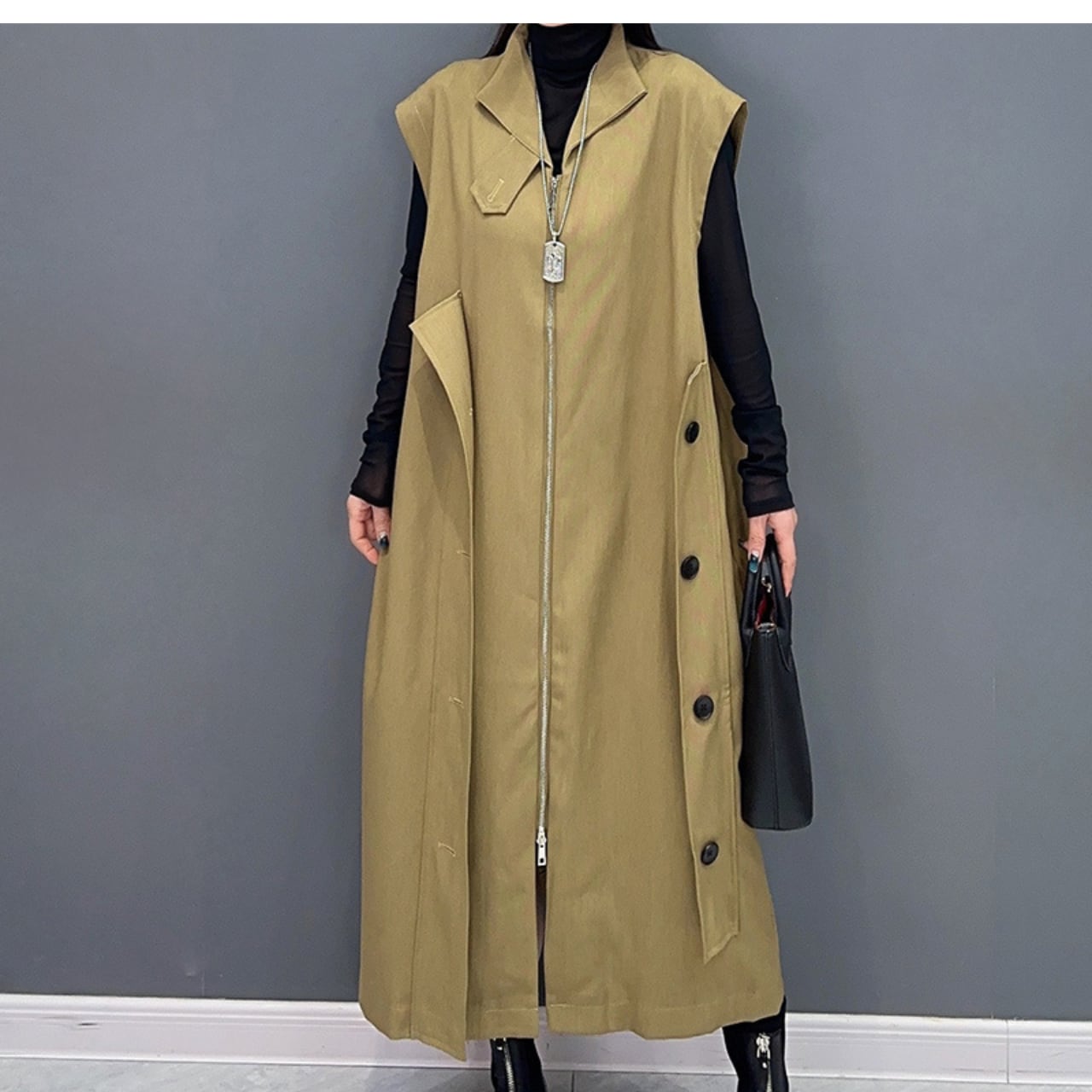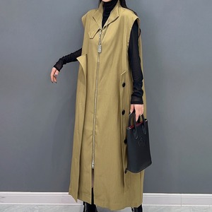 ロング丈のノースリーブジレは、様々なトップスと合わせやすく、着回し力抜群。Aラインのシルエットで、体型カバー効果も期待できます。カジュアルなスタイルから、きれいめなスタイルまで幅広く対応できる、着心地の良いアイテムです。