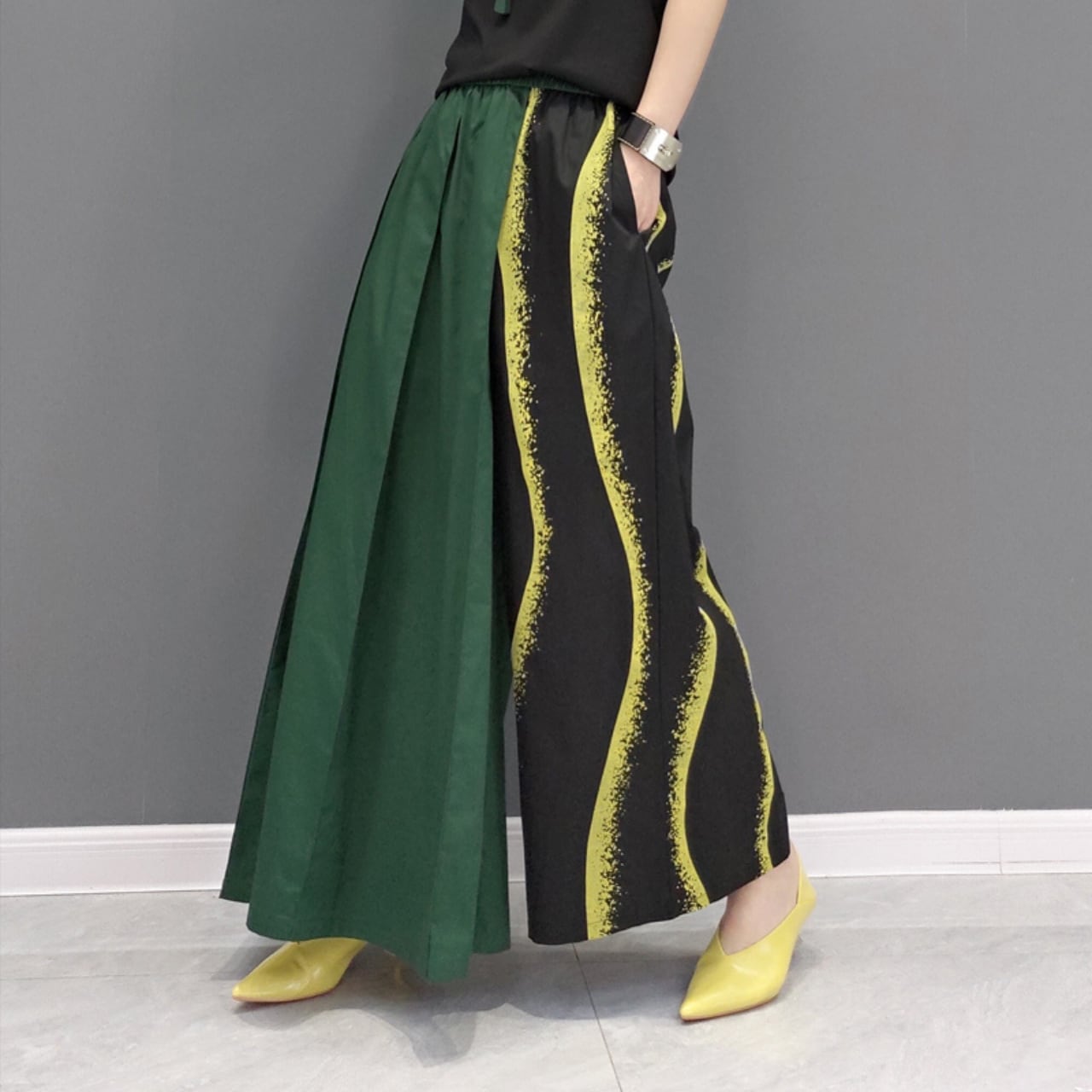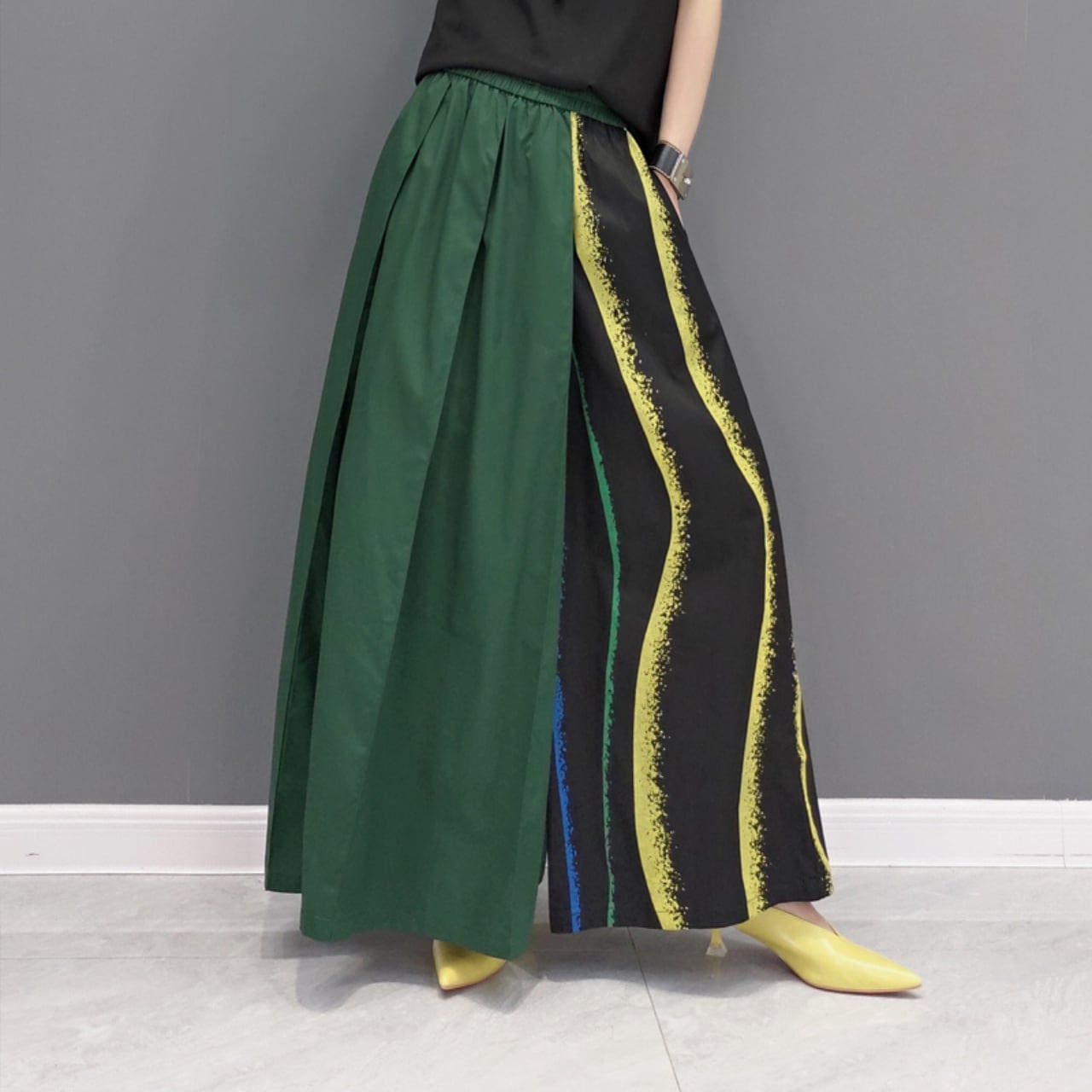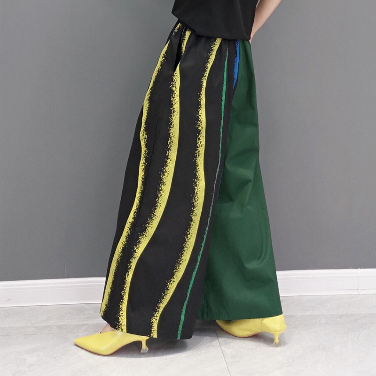 リラックス感と個性を両立したワイドパンツ。ウエストゴム仕様で、締め付け感なく一日中快適に過ごせます。無地とストライプ柄の組み合わせが、シンプルながらも洗練された印象を与えます。カジュアルなトップスからきれいめなブラウスまで、幅広いコーディネートに合わせやすく、着回し力も抜群です。