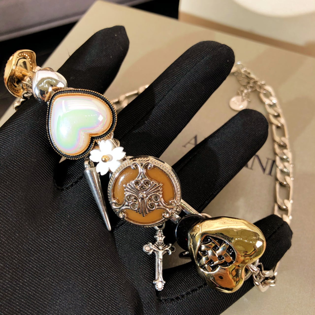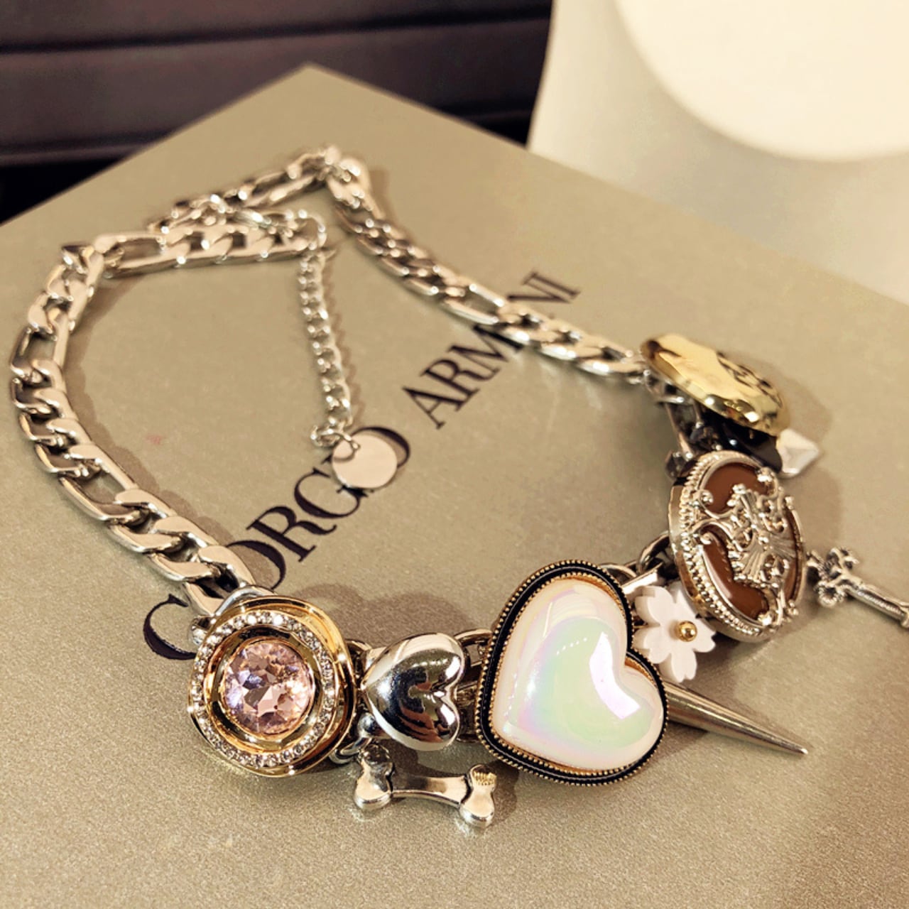 複数のチャームが揺れる、デザイン性の高いネックレス。一つ一つ異なるデザインのチャームが、視覚的なアクセントとなり、着けるだけでこなれた雰囲気を演出します。カジュアルなスタイルにも、ドレスアップしたスタイルにもマッチします。