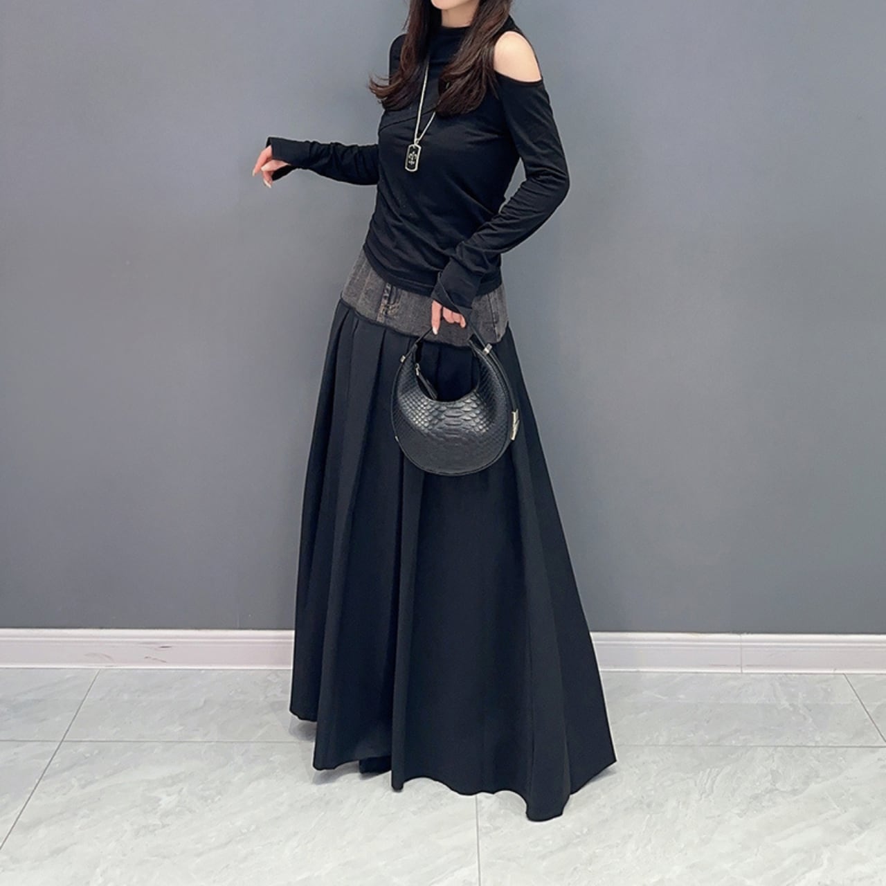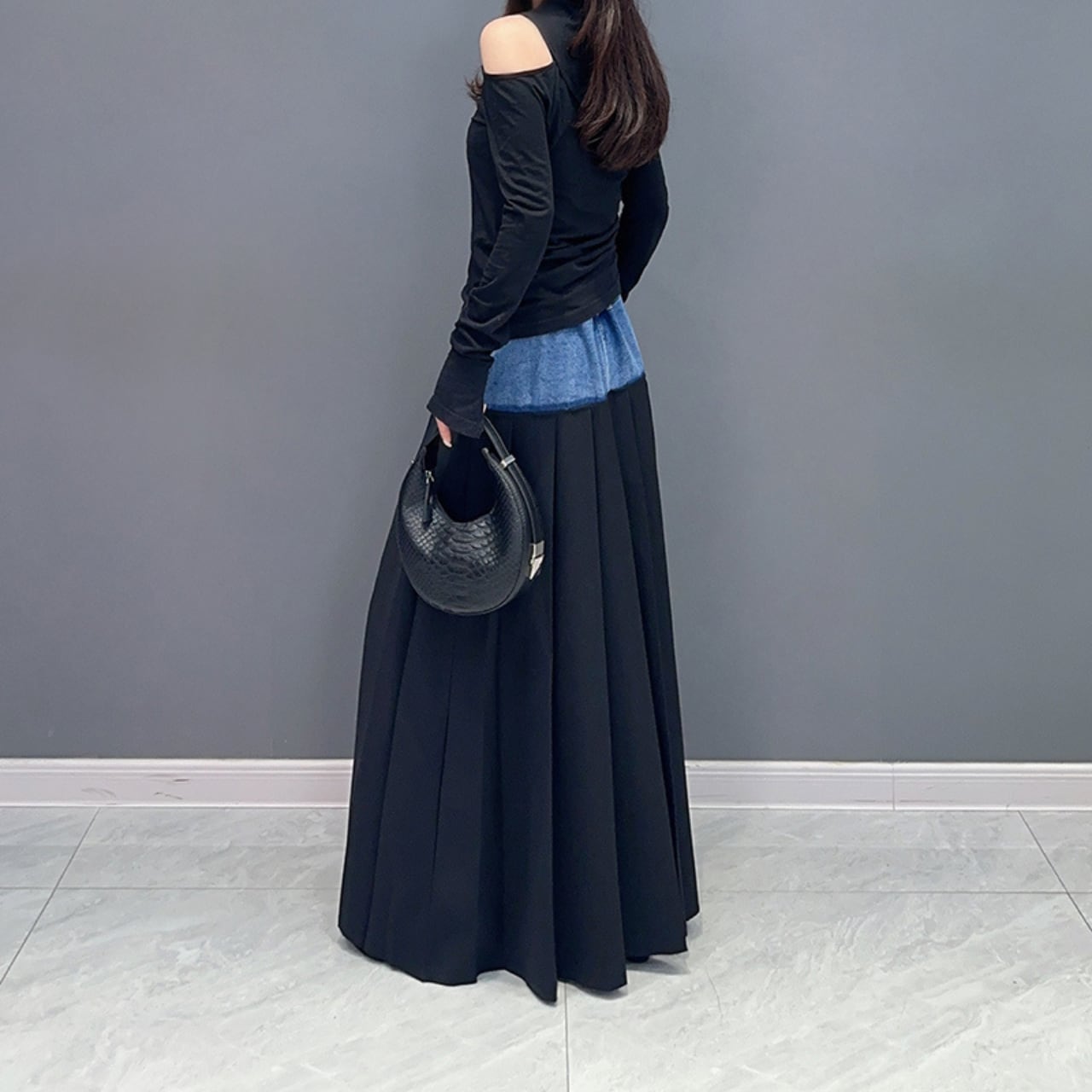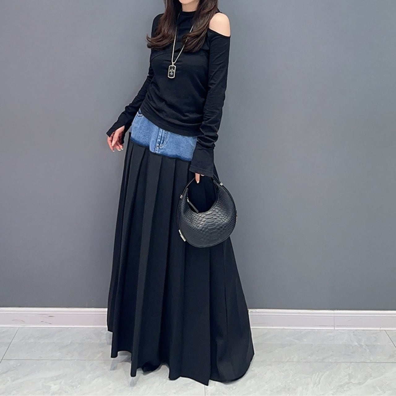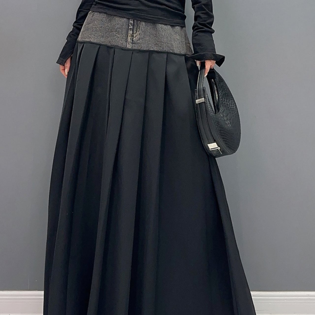 デニム切替マキシ丈プリーツスカート R0012