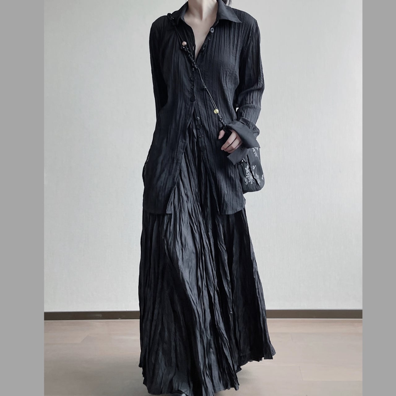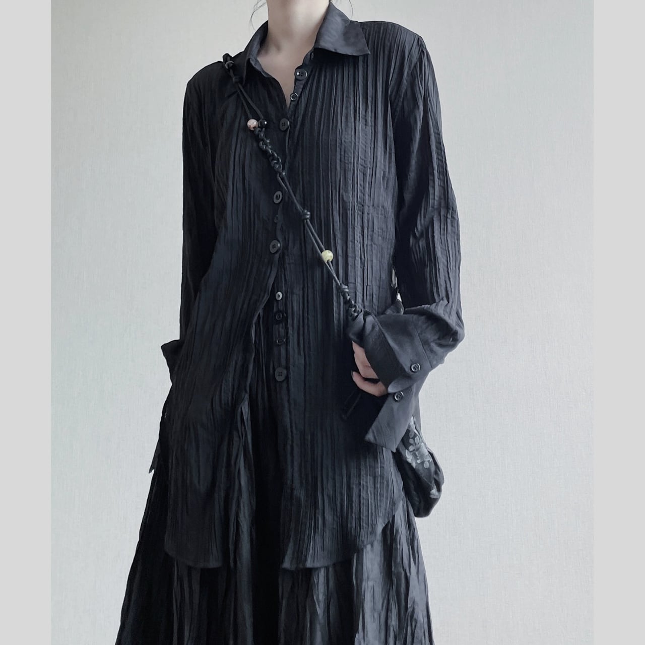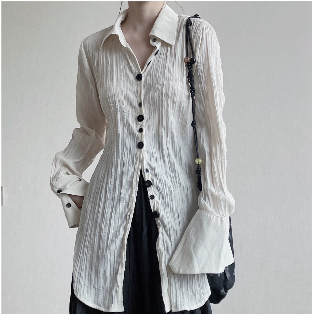 着心地の良さとスタイリッシュさを両立させた、ロングスリーブシャツ。クリンクル加工の独特な表情が、カジュアルながらも上品な印象を与えます。比翼仕立てのシンプルなデザインは、様々なボトムスとのコーディネートを楽しめます。デイリーユースからちょっとしたお出かけまで、幅広いシーンで活躍します。