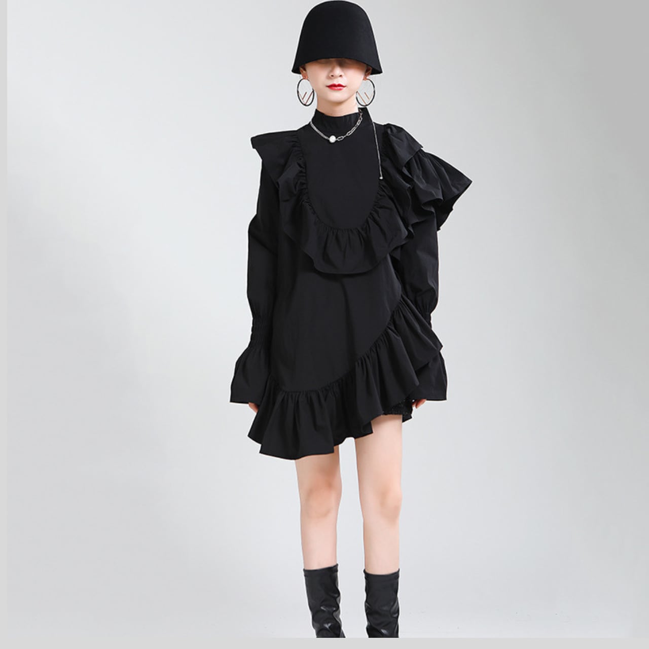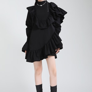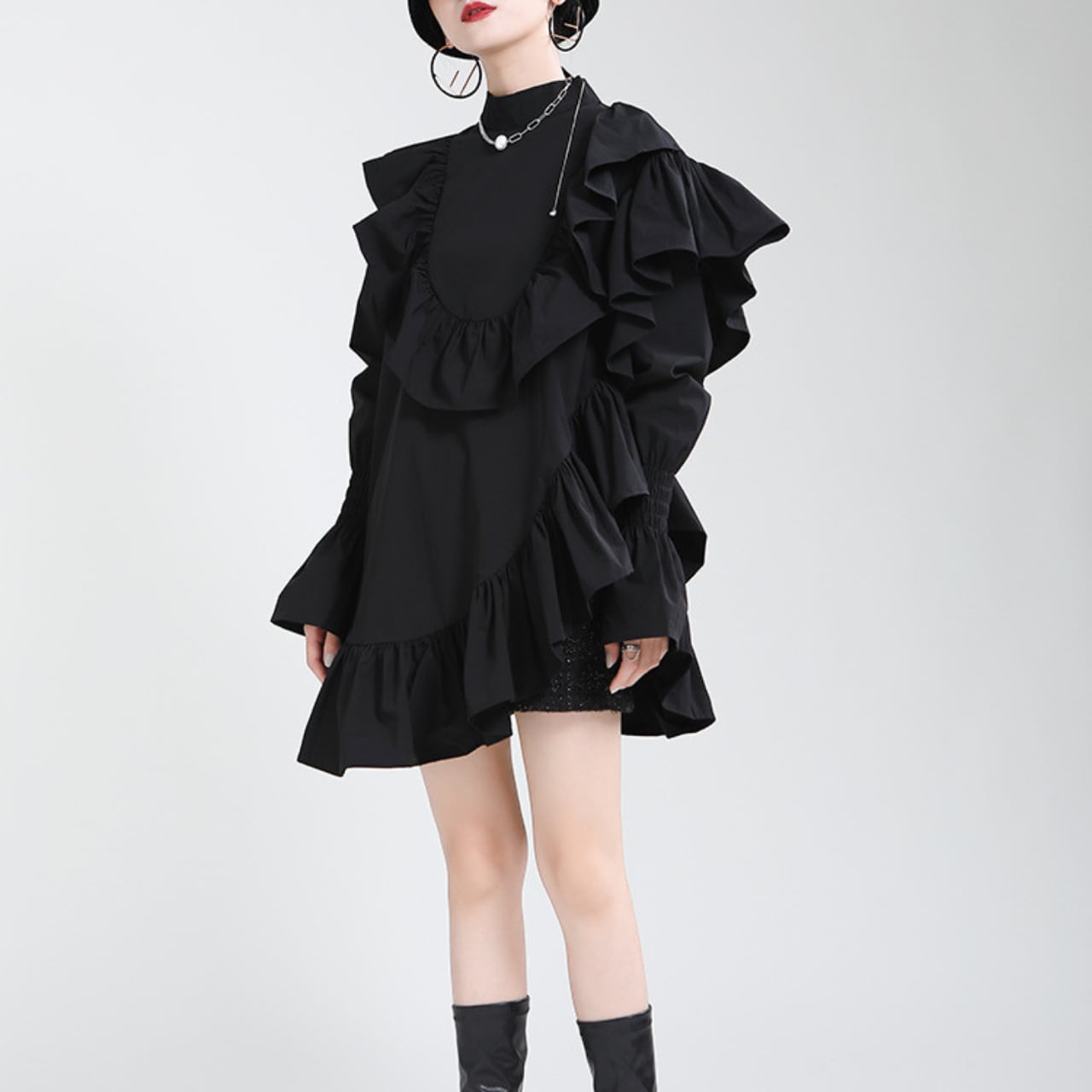 ゆったりとしたシルエットと、たっぷりとしたフレアスリーブが、着る人の体型を気にせずリラックスした雰囲気を演出します。ハイネックデザインが首元をすっきりとさせ、ミニ丈で軽やかな印象を与えます。シンプルながらも、存在感のあるデザインで、普段使いから特別なシーンまで幅広く活躍します。