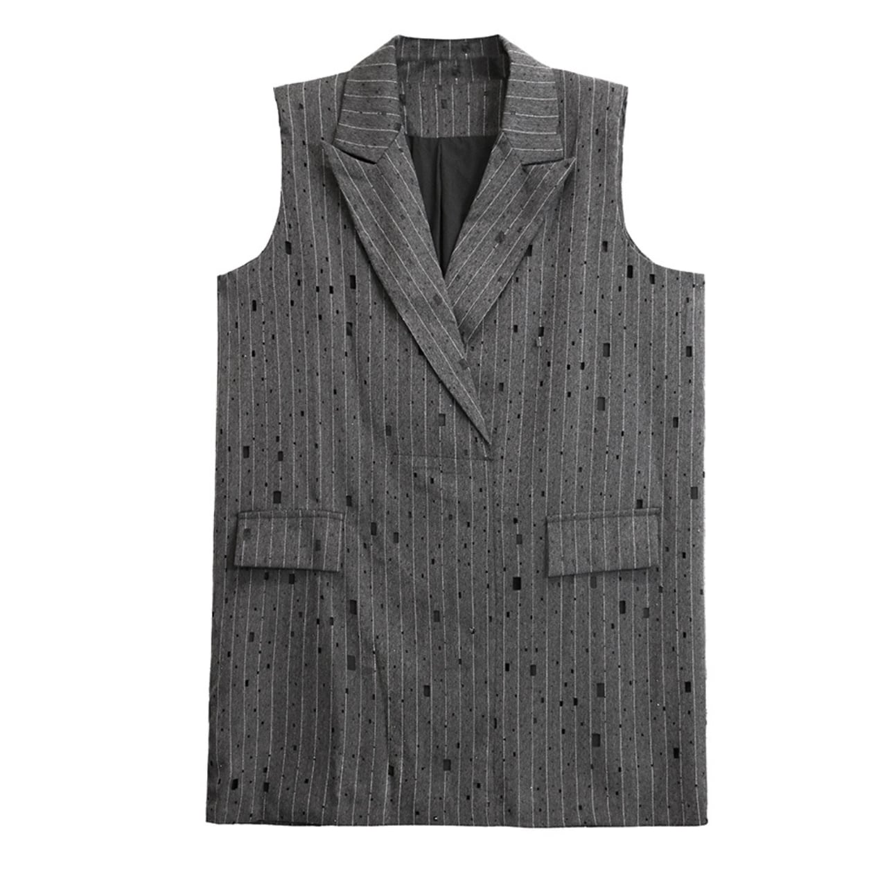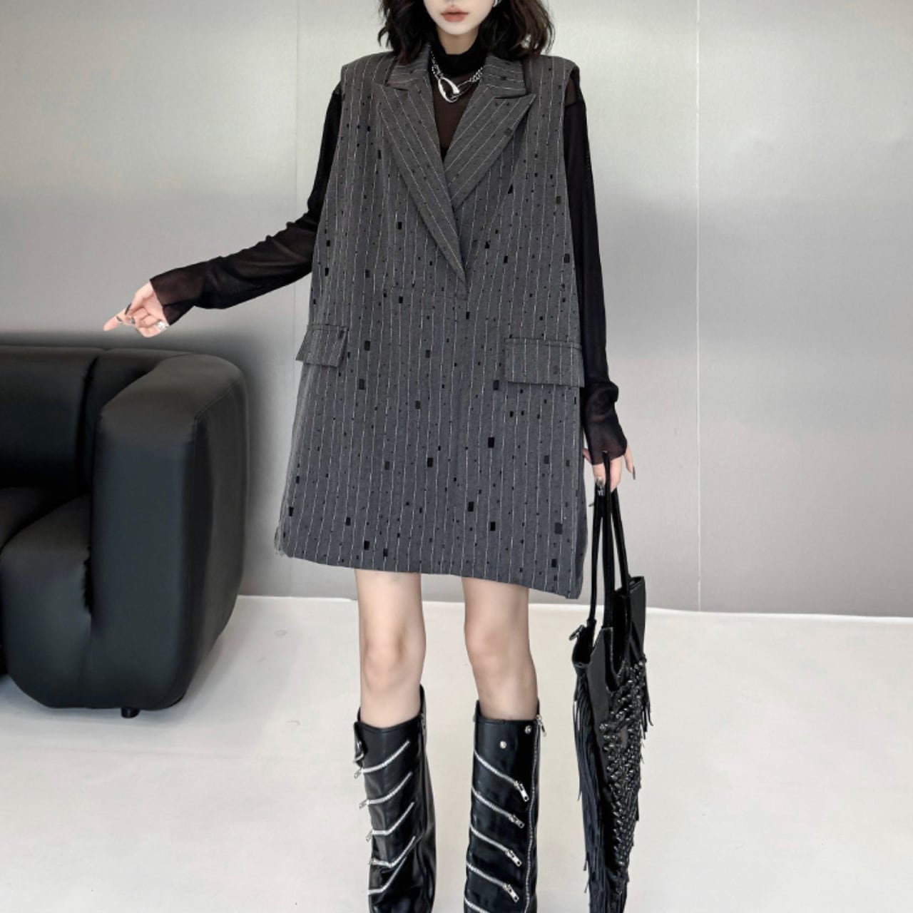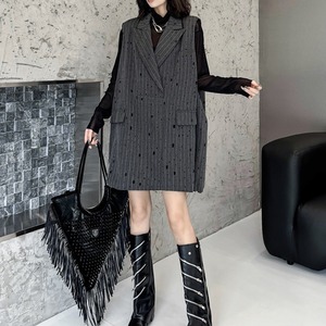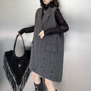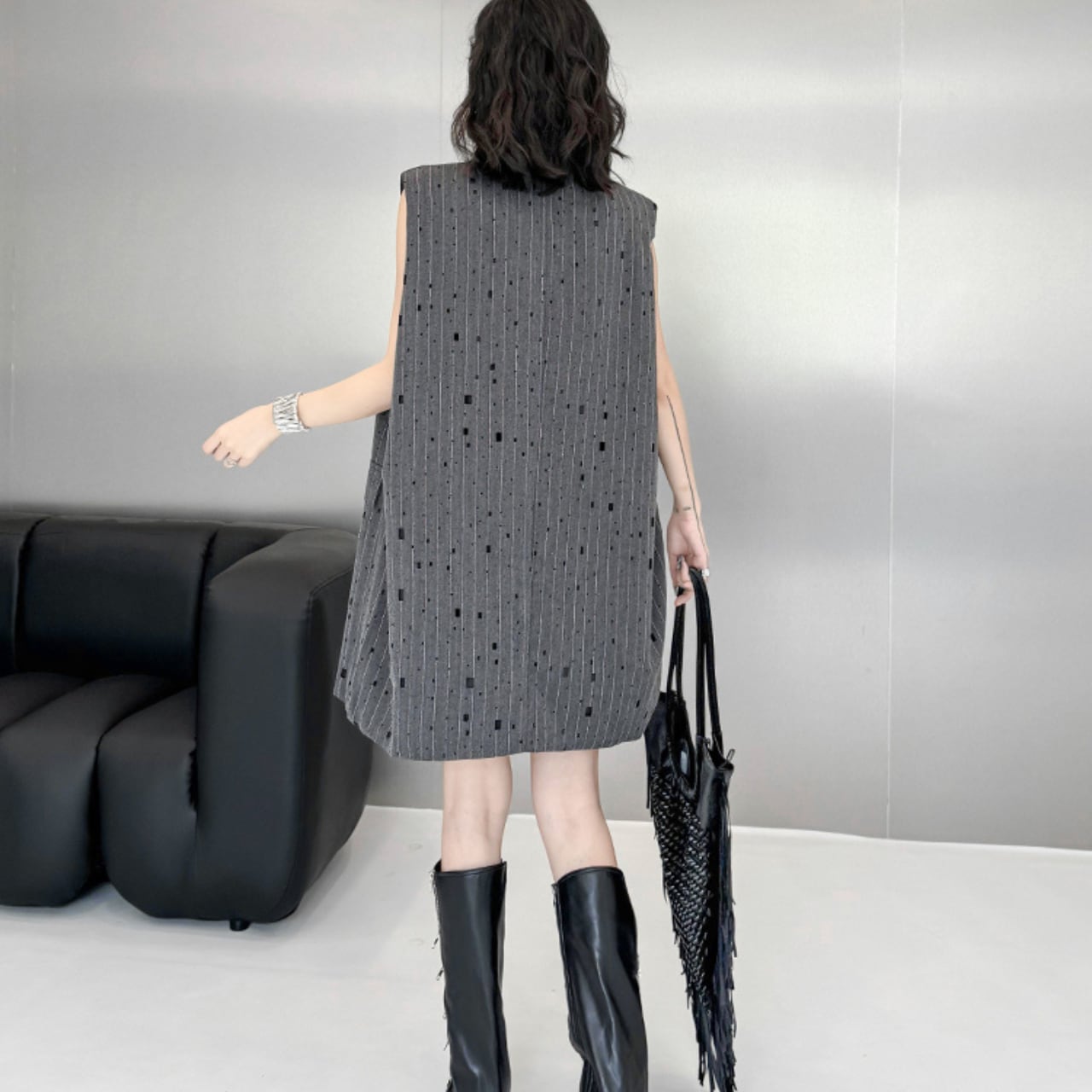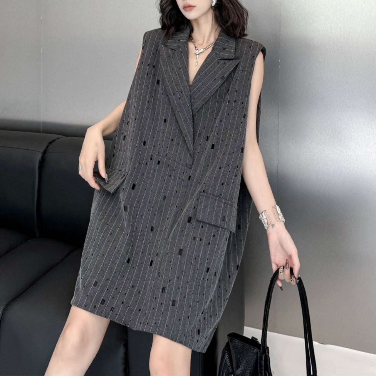 ゆったりとした着心地のワンピースベスト。ピンストライプ柄が、カジュアルながらもスタイリッシュな雰囲気を醸し出します。ミニ丈のデザインが、軽やかで女性らしい印象を与え、様々なスタイルに合わせやすいのも魅力です。一枚で着ても、ブラウスやTシャツとのレイヤードスタイルも楽しめます。