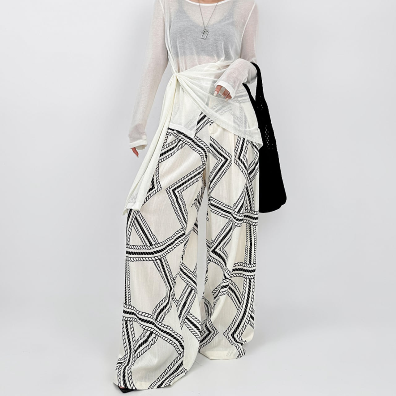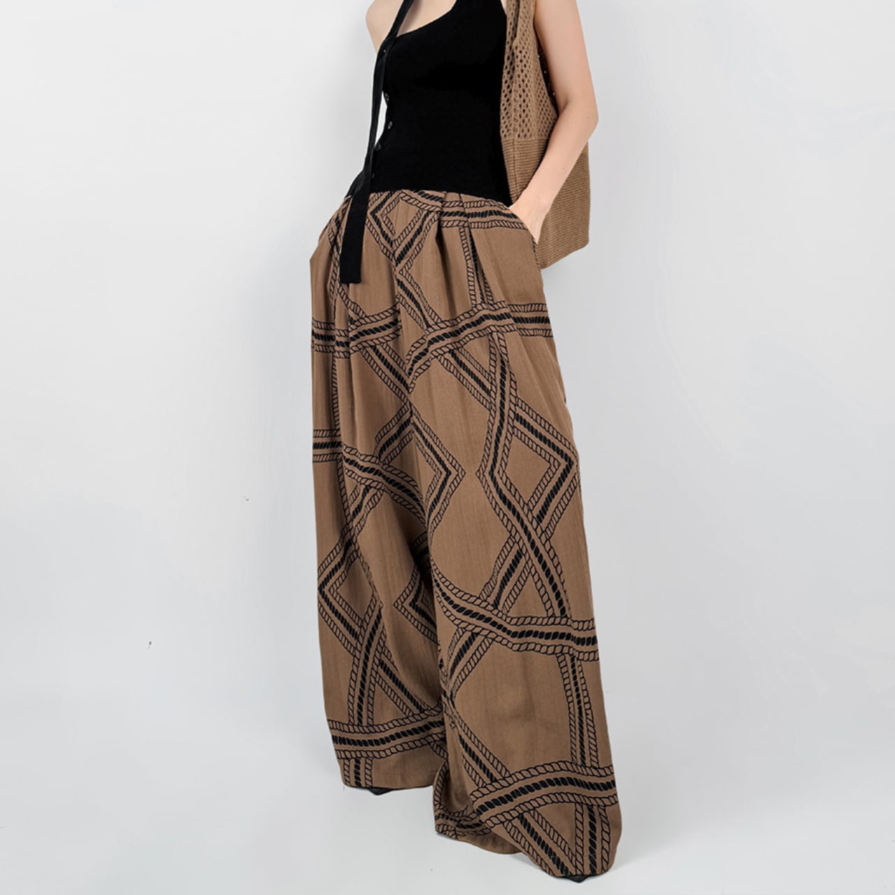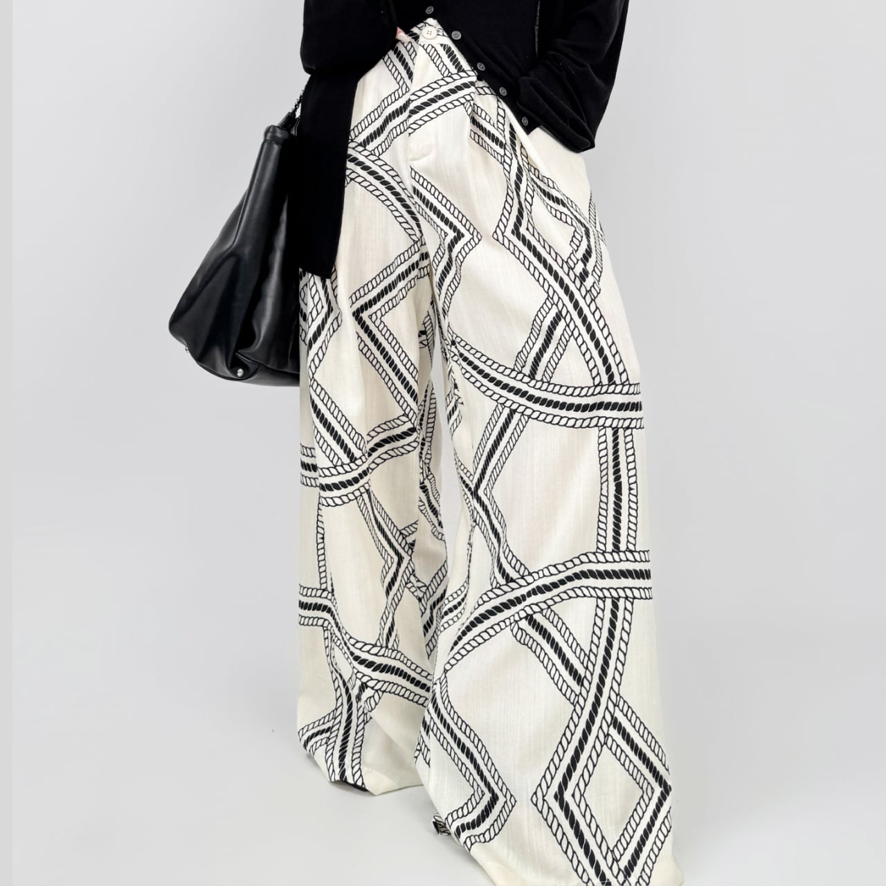 ゆったりとしたワイドレッグシルエットで、体のラインを拾わず、リラックス感のある着こなしが叶います。幾何学模様が洗練された印象を与え、シンプルなトップスと合わせるだけで、こなれ感のあるスタイリングが完成します。日常使いからちょっとしたお出かけまで、幅広いシーンで活躍してくれる一着です。
