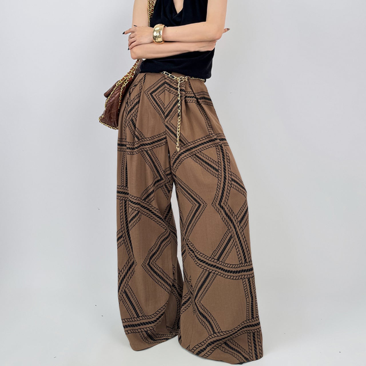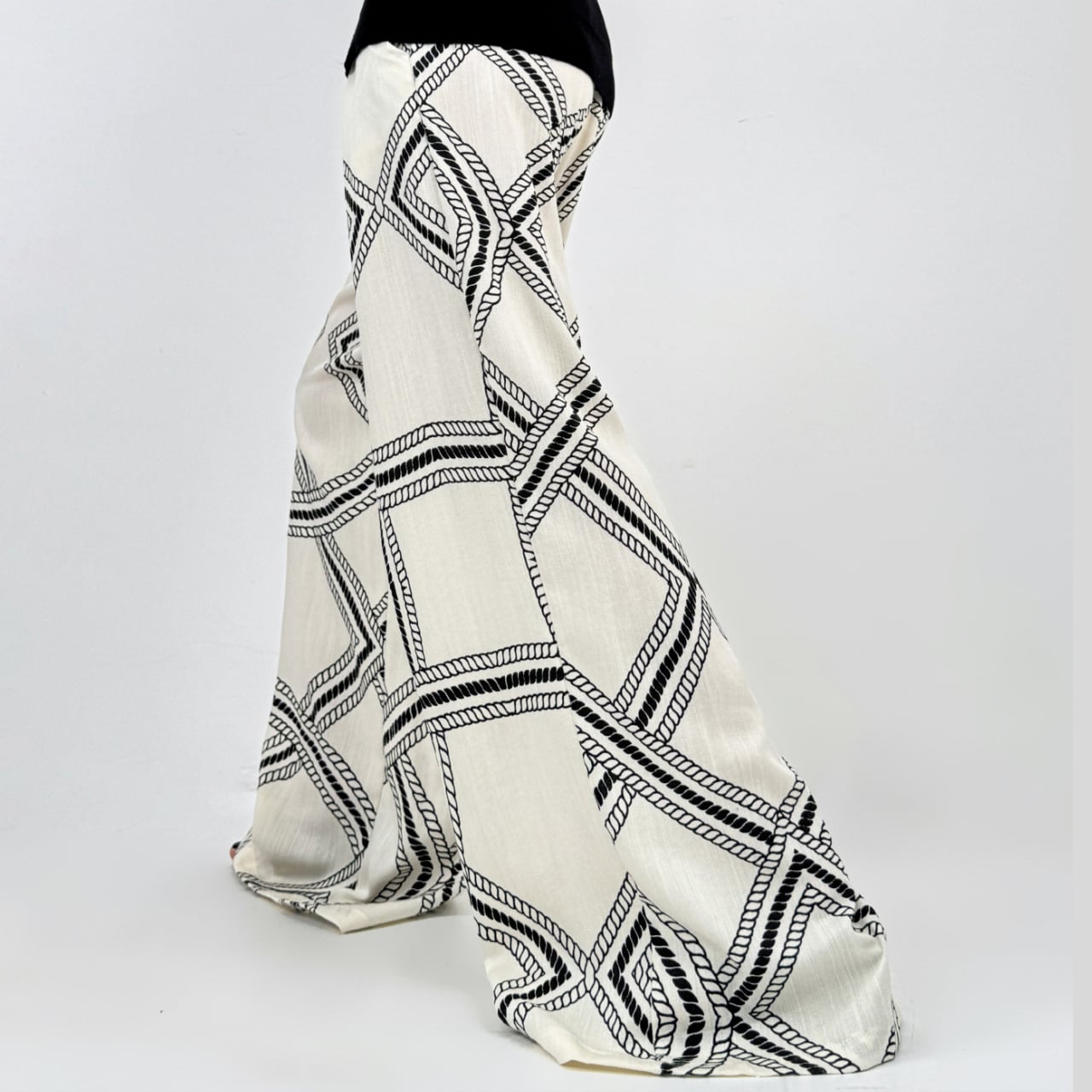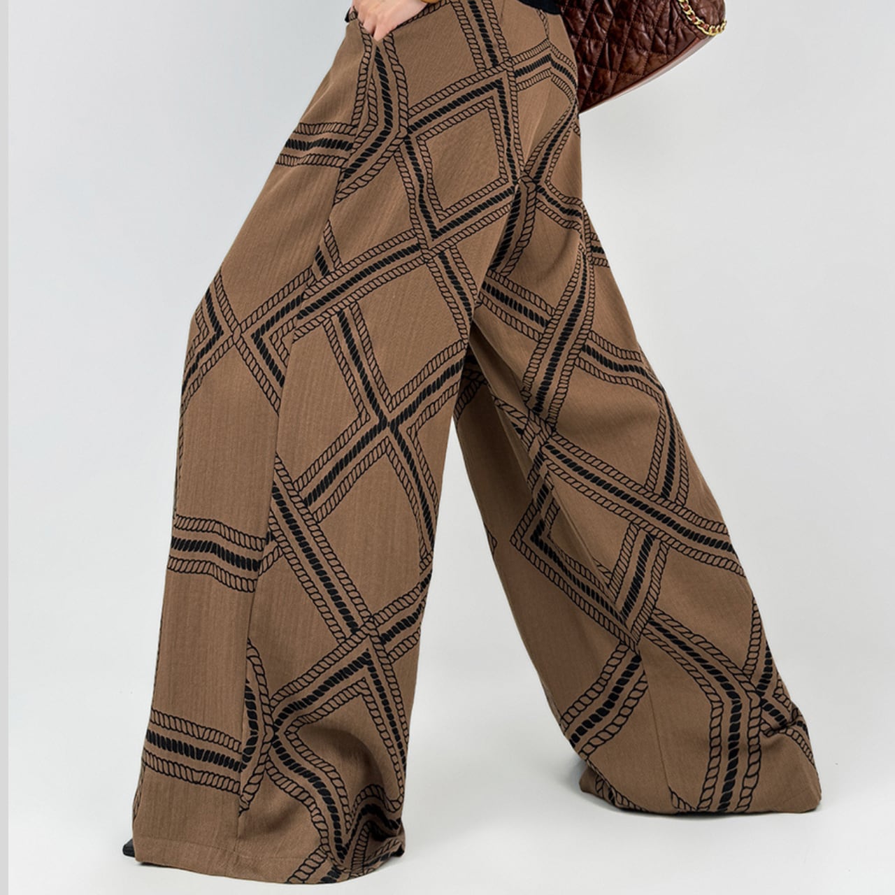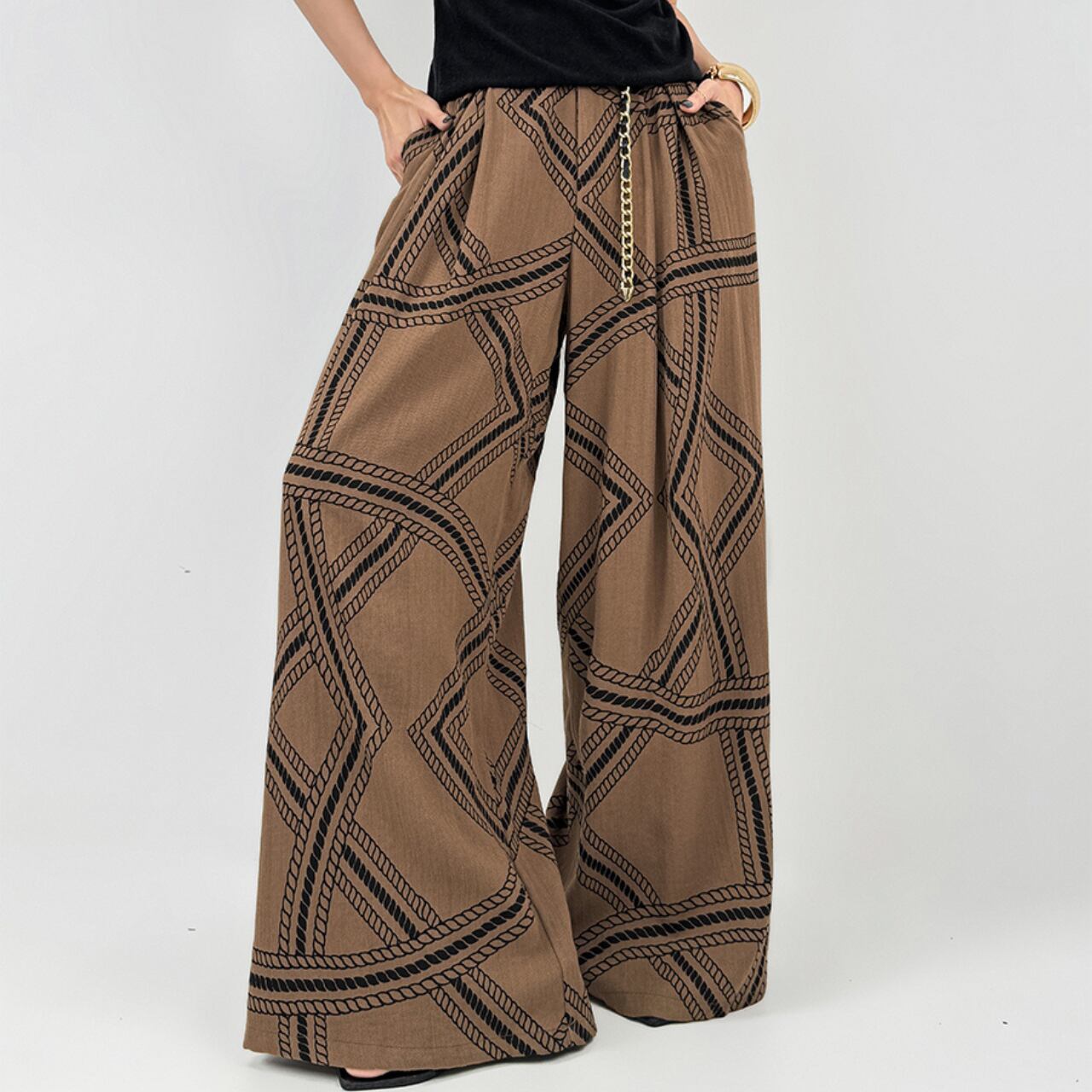 ゆったりとしたワイドレッグシルエットで、体のラインを拾わず、リラックス感のある着こなしが叶います。幾何学模様が洗練された印象を与え、シンプルなトップスと合わせるだけで、こなれ感のあるスタイリングが完成します。日常使いからちょっとしたお出かけまで、幅広いシーンで活躍してくれる一着です。