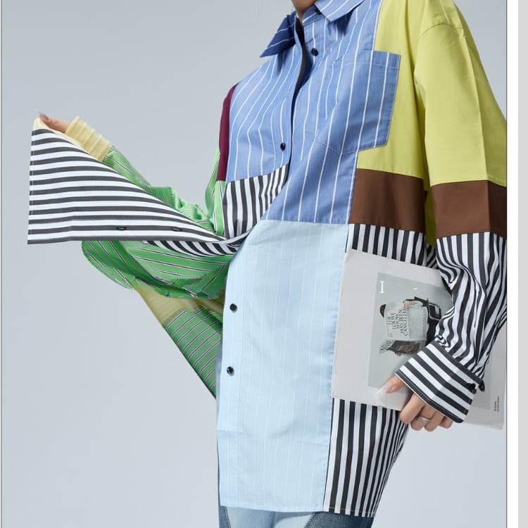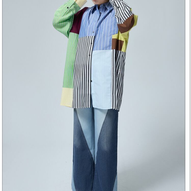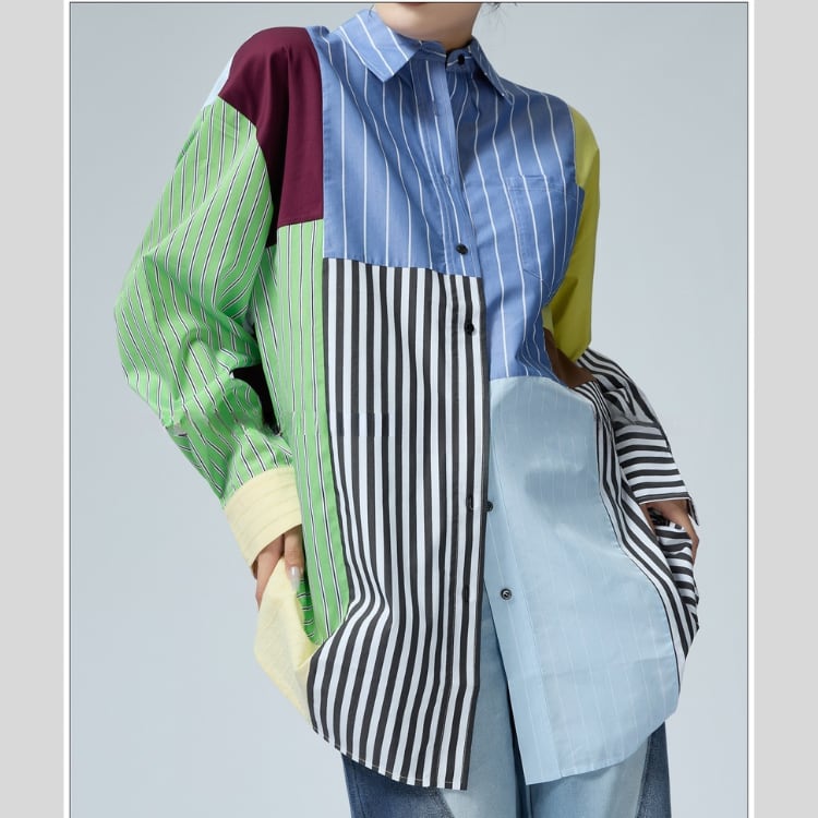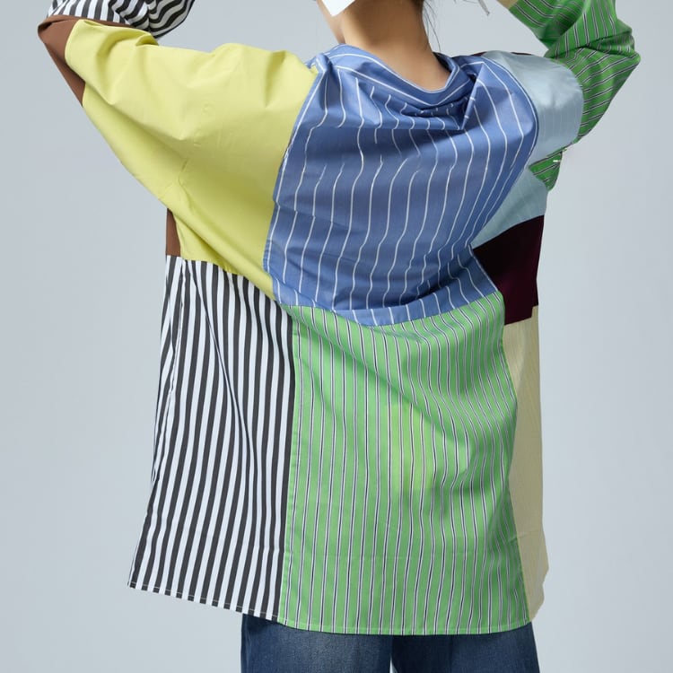 一枚で主役級の存在感を放つ、パッチワークデザインのロングスリーブシャツ。異なるストライプ柄の生地を組み合わせた個性的なデザインは、着るだけでスタイリッシュな印象に。リラックスしたシルエットで、デイリーユースにも最適です。