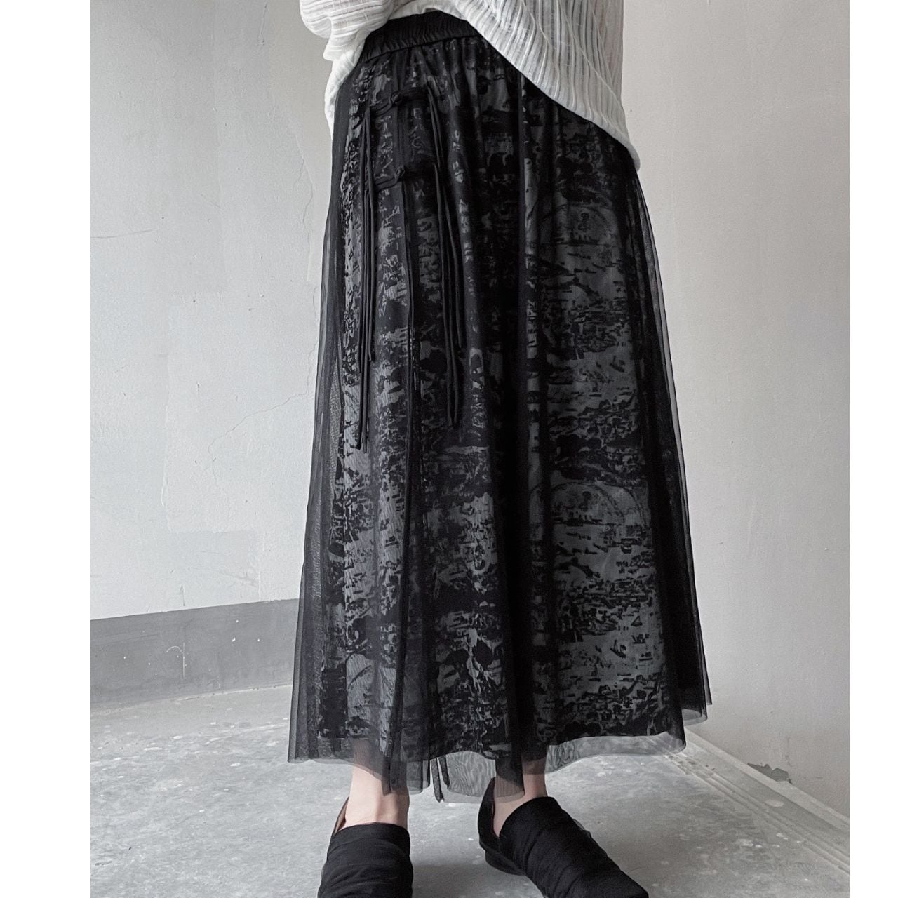 アシンメトリーデザインが目を惹くマキシ丈スカート。ゆったりとしたシルエットで、体のラインを拾わずリラックスした着心地を実現しました。