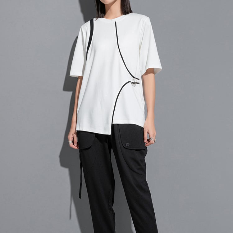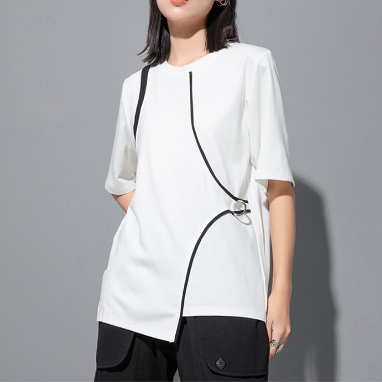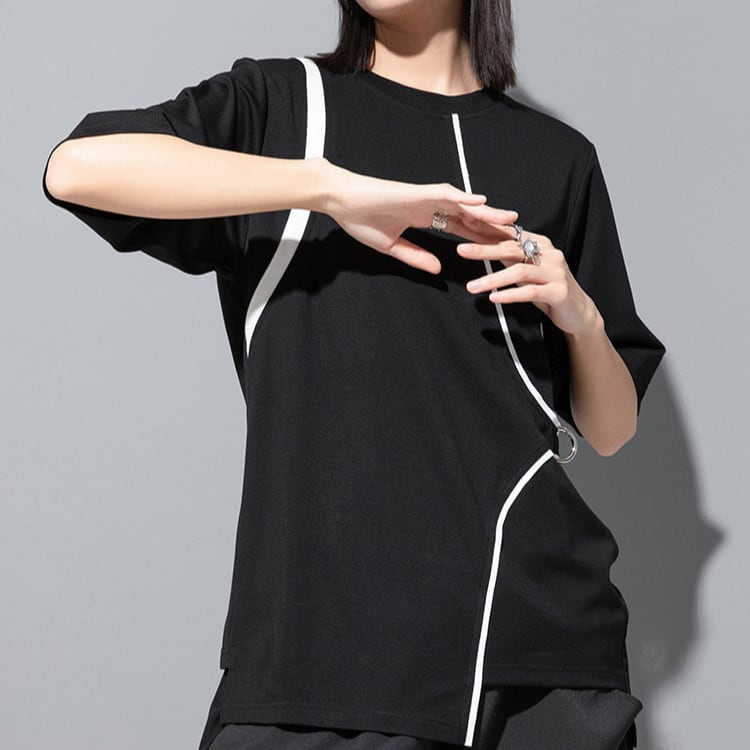 ミニマルな中に個性が光る、パイピングとリング装飾が魅力のデザインTシャツ。