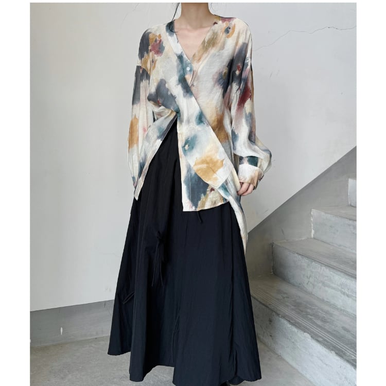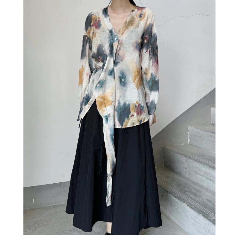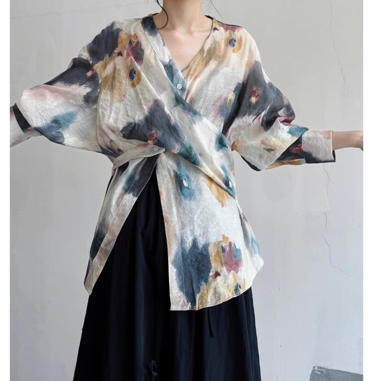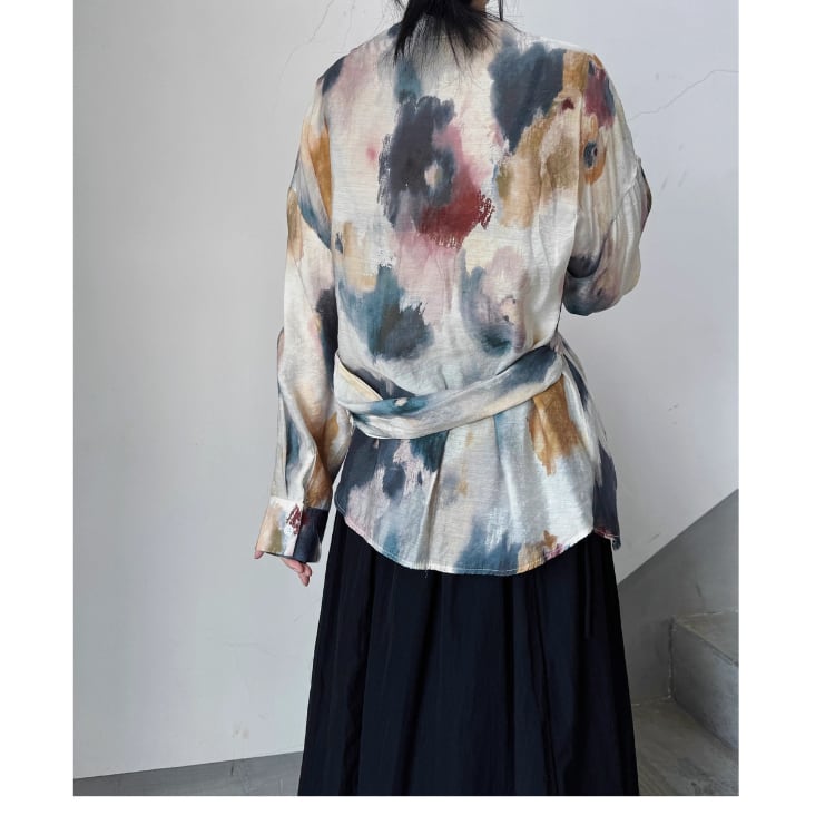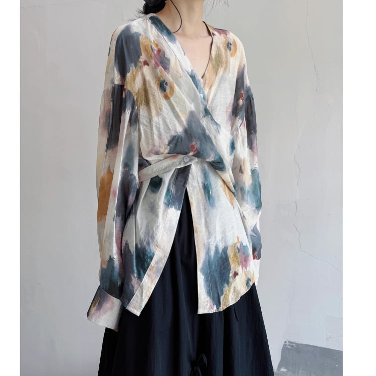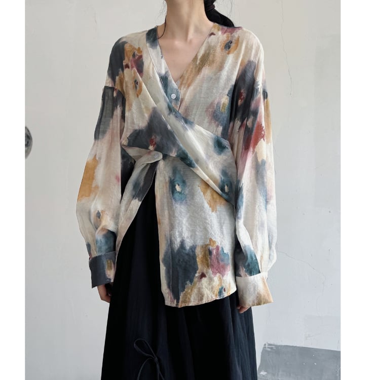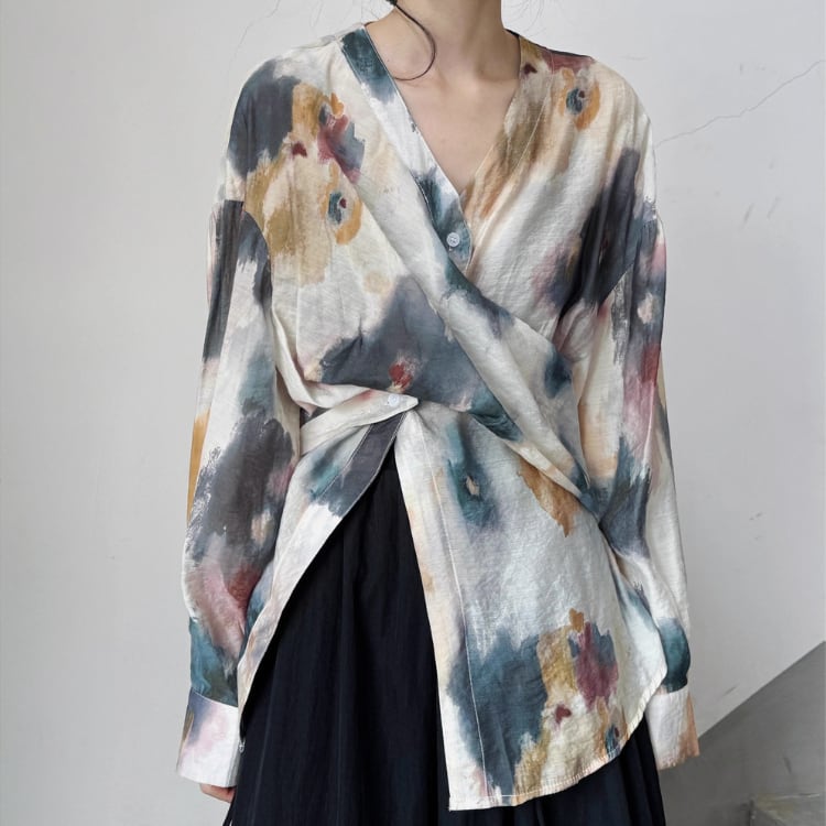 水彩画のようなアーティスティックなプリントが目を引く、クロスデザインの長袖ブラウス。