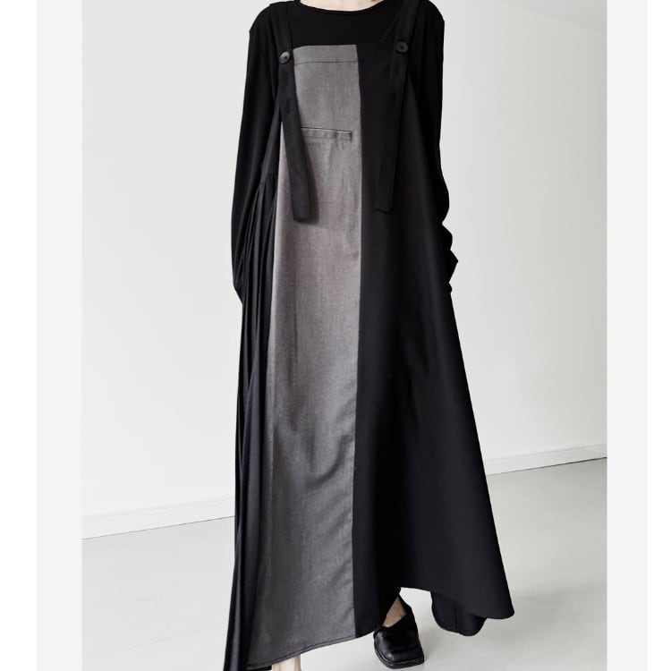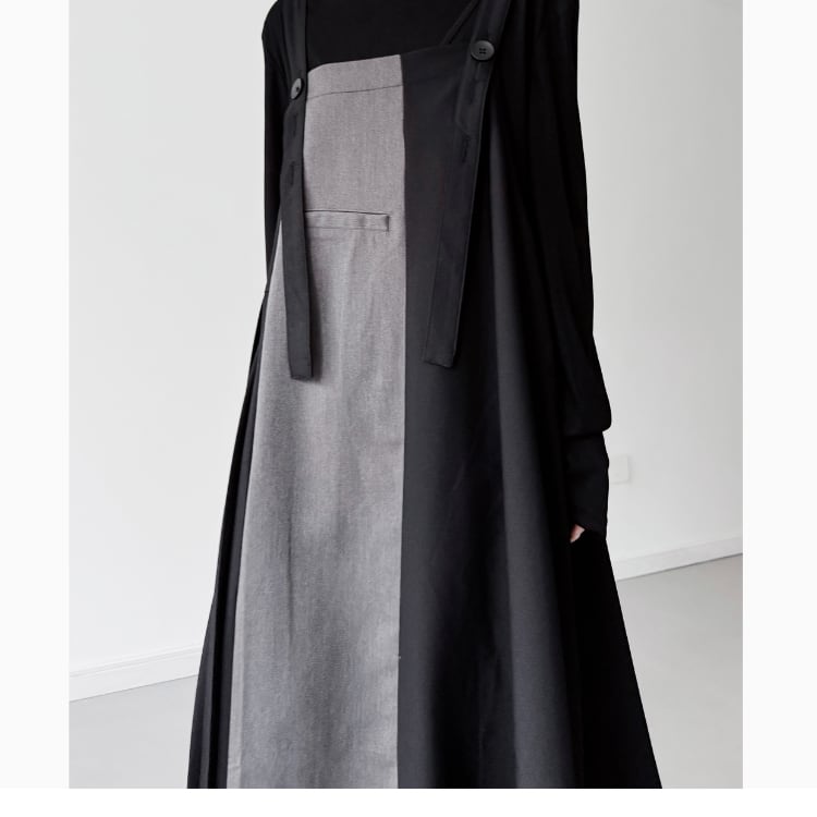 大胆なバイカラー切替とシンプルながら印象的な縦ライン目が魅力的、感性派のためのジャンパースカート。肩ひもの