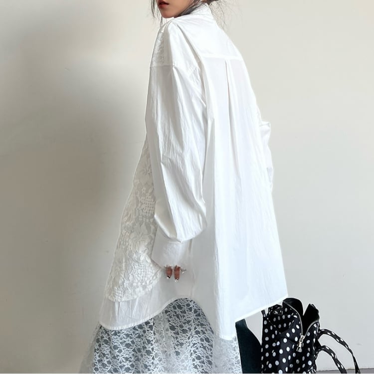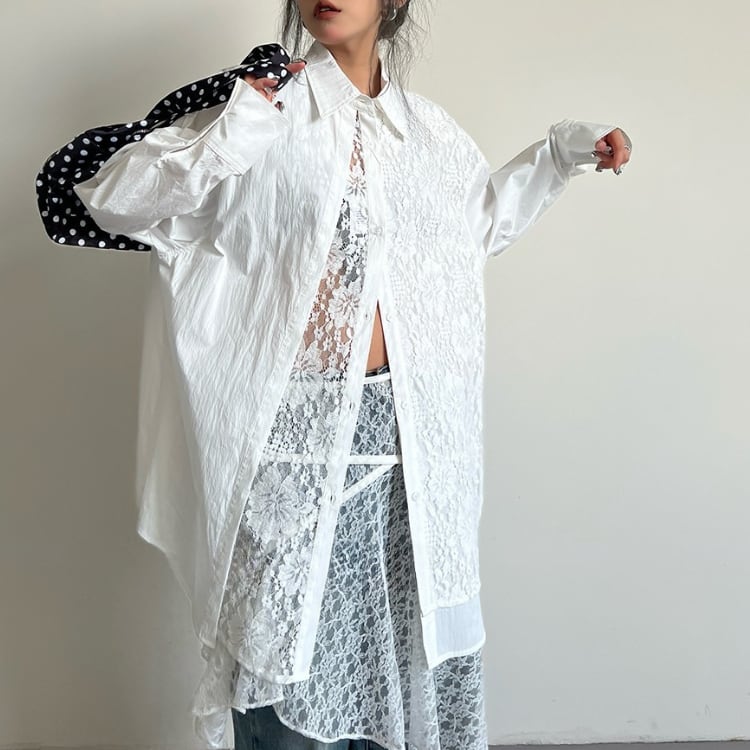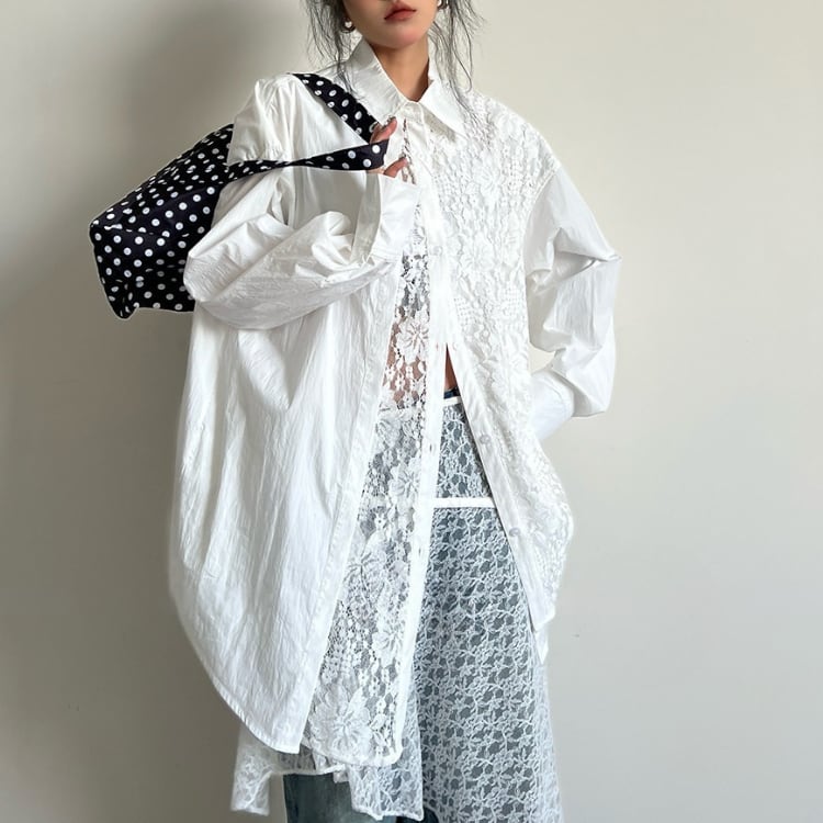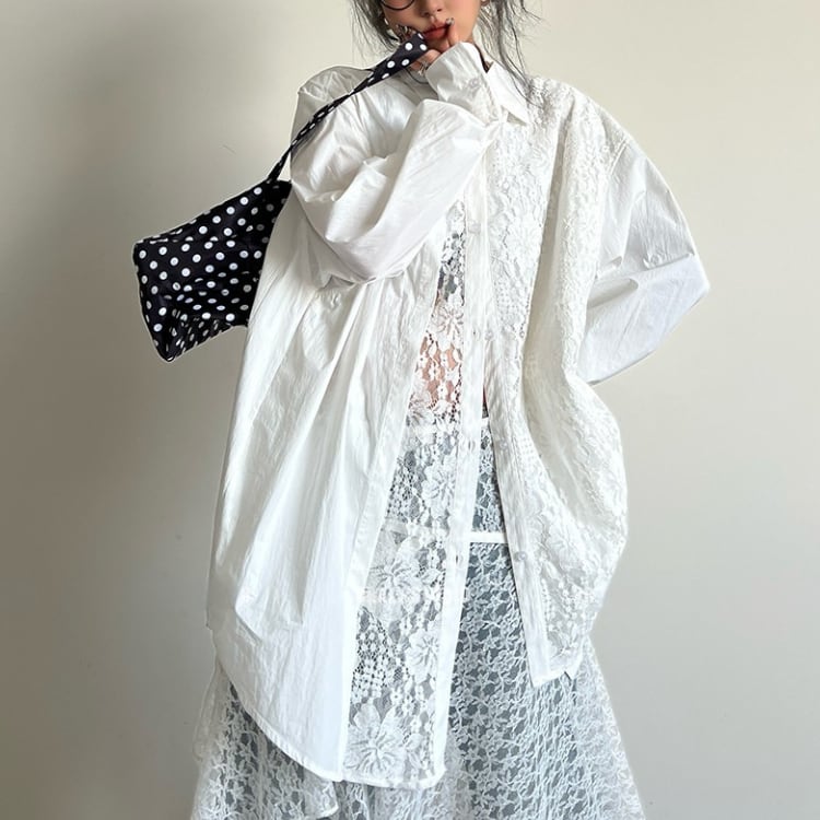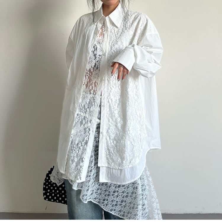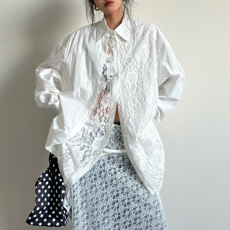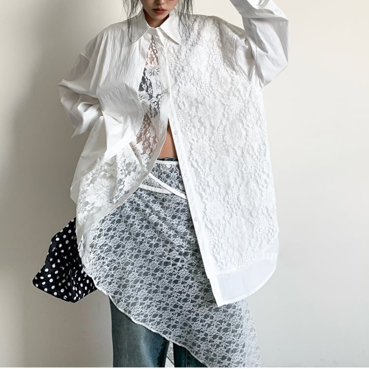 立体的なレース切り替えが目を惹く、存在感抜群のオーバーサイズシャツ。