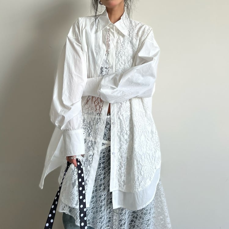 レース切替ビッグシルエットシャツ|アシンメトリー×レイヤード風デザイン R01442