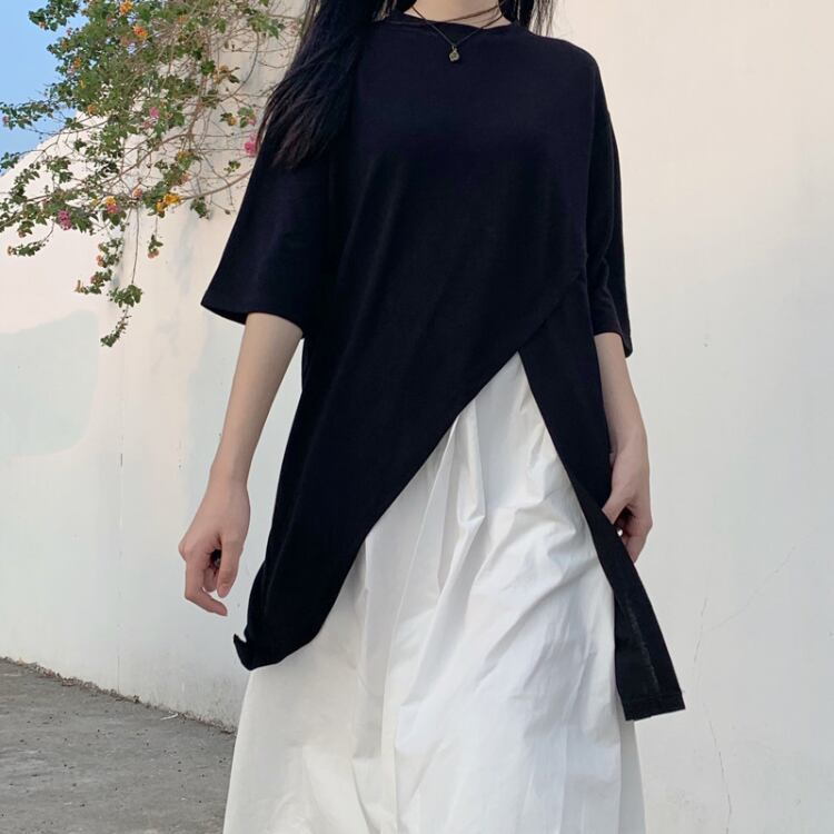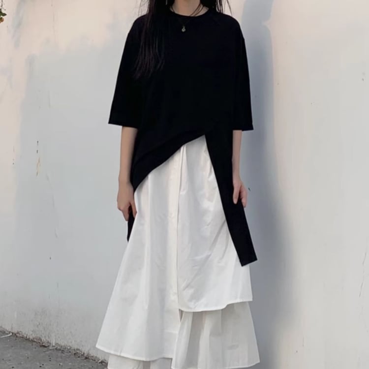 個性を引き立てる、アシンメトリーなカットが印象的な中長丈Tシャツ。