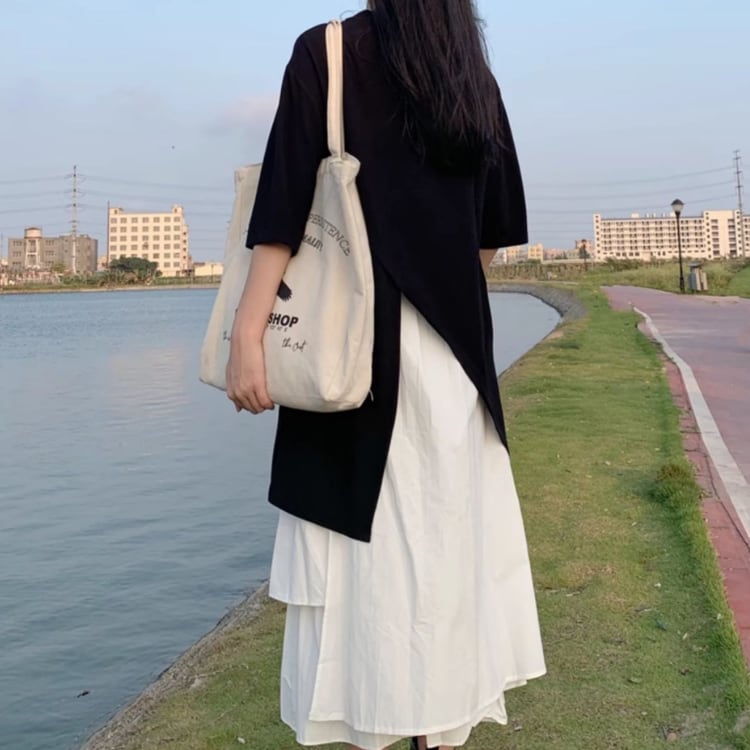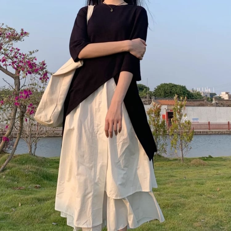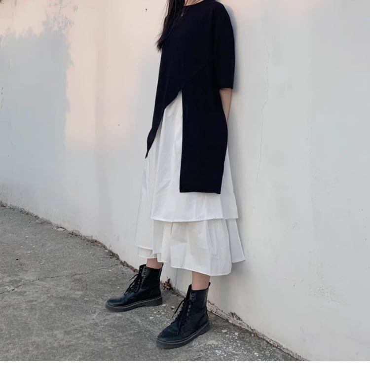 動きのある不規則な裾が、自然な体型カバーとスタイリッシュな雰囲気を両立させます。