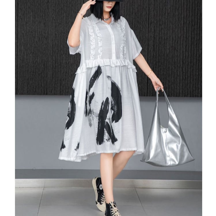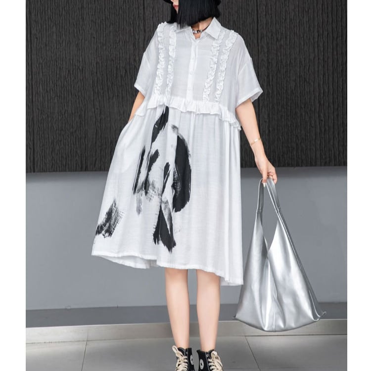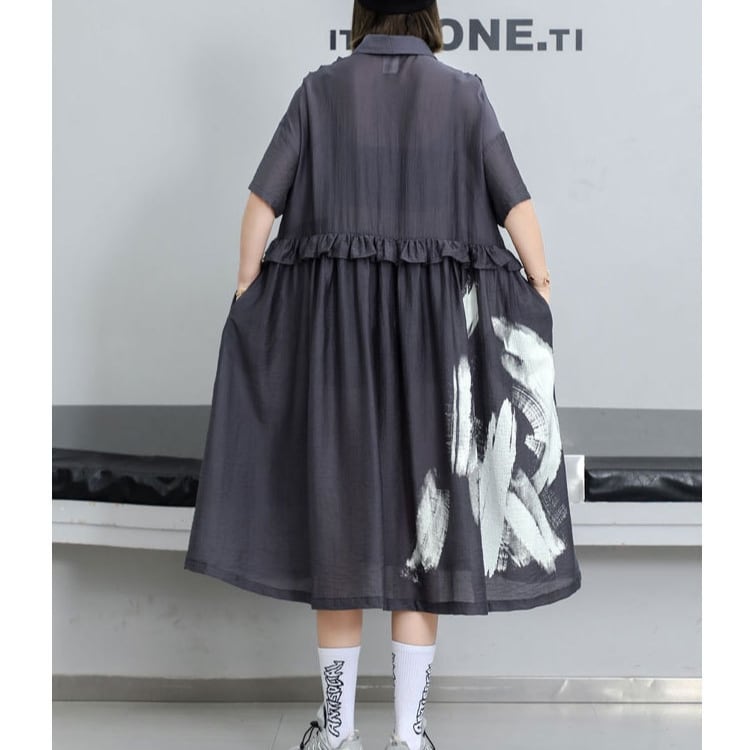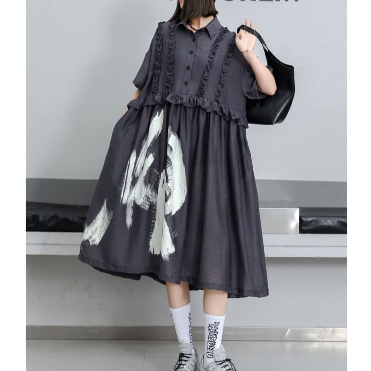 アート風プリント×フリル切替シャツワンピース ◆2col R01517