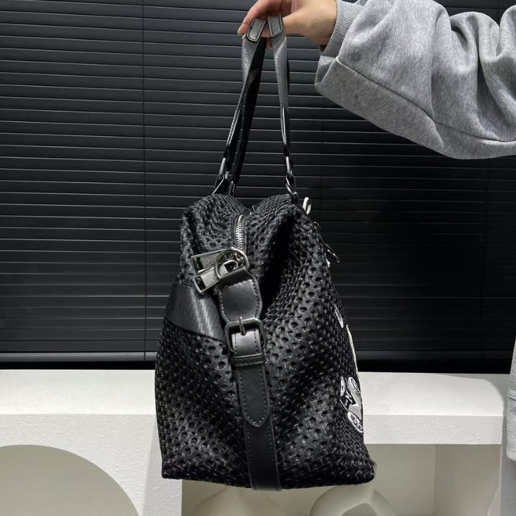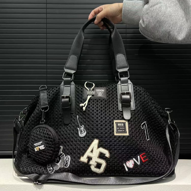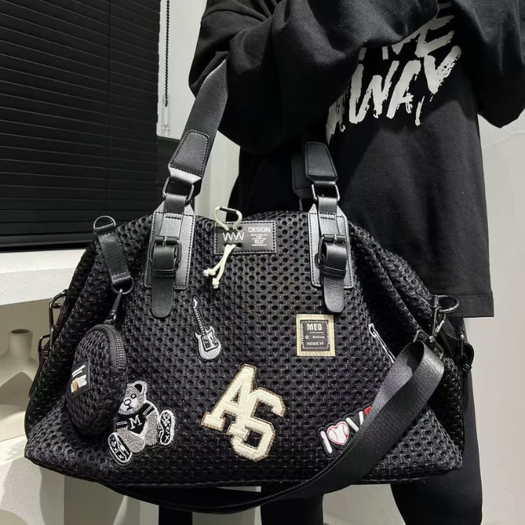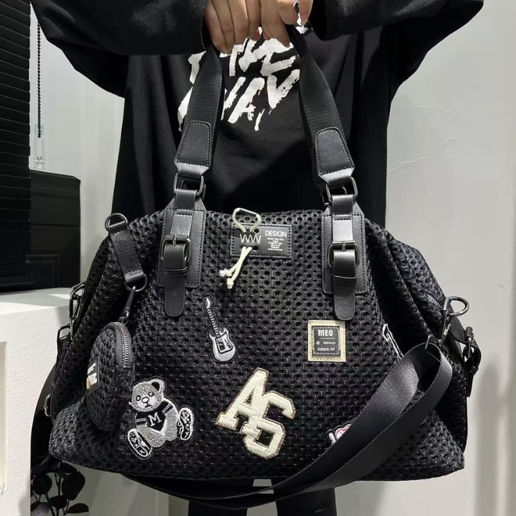 クマ・ギター・ロゴなど多彩な刺繍ワッペンが目を惹く、大容量トラベルバッグ。メッシュナイロンの軽やかさとストリート感を融合させたデザインで、オンリーワンな存在感を放ちます。