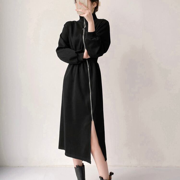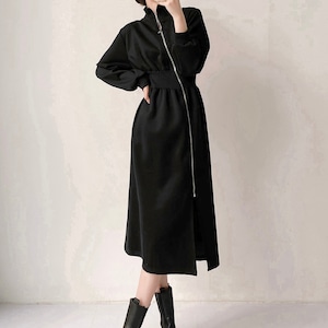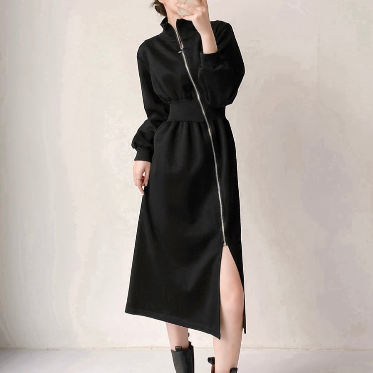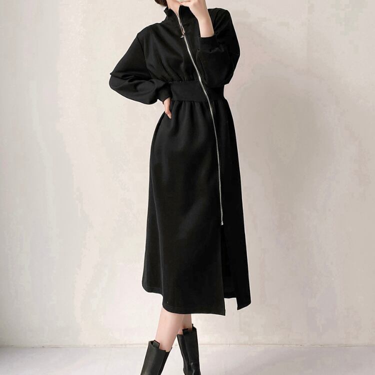 フロントに走るフルジップが印象的で、開閉の具合でスリットの深さを自在に調整可能。ウエストはさりげなくシェイプされ、着るだけでスタイルアップ。