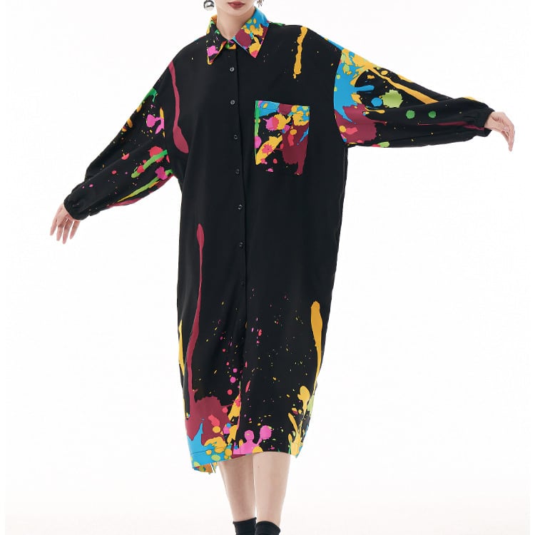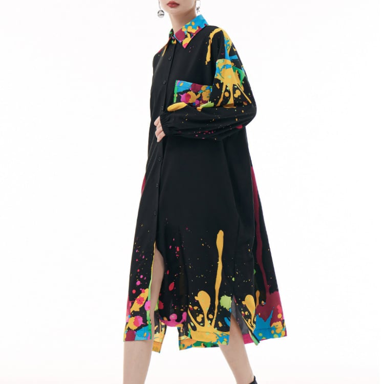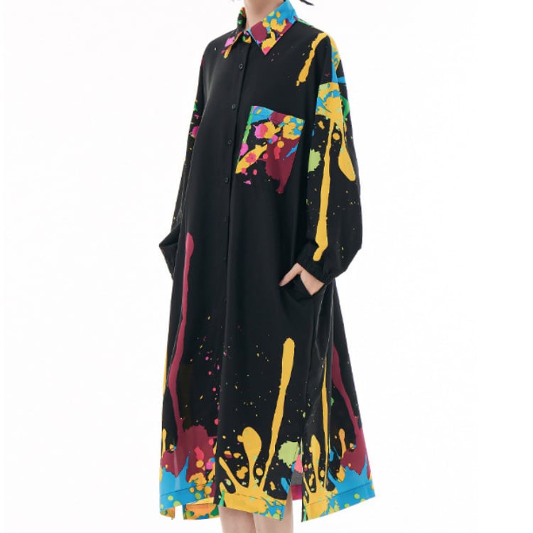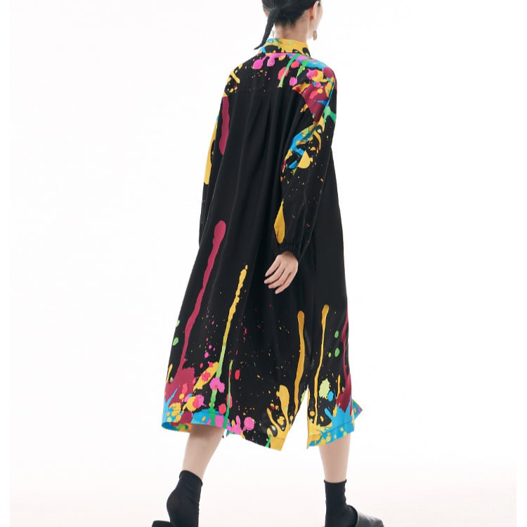 大胆なカラースプラッシュが目を引く、アート感覚あふれるシャツワンピース。