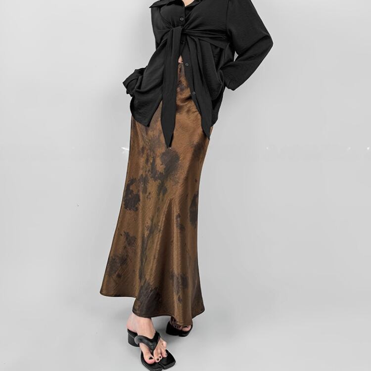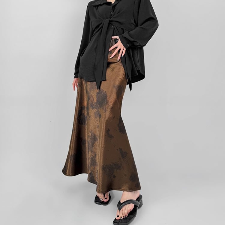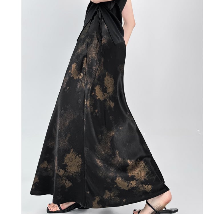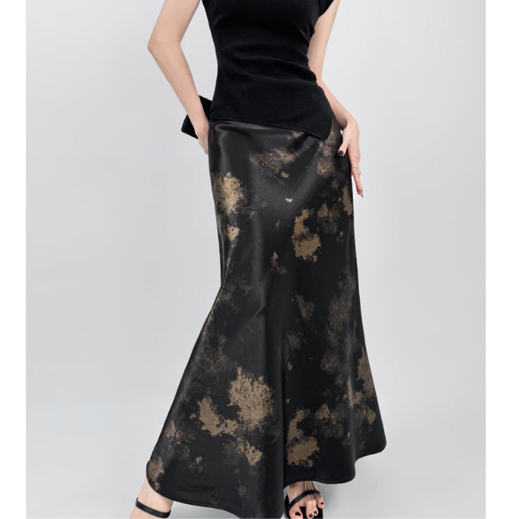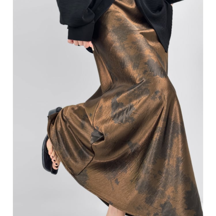 艶やかな光沢と、独特なグラデーションが目を惹く高見えロングスカート。しっとりと緩やかとAラインシルエットが、腰回りをすっきり