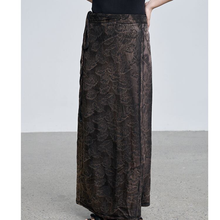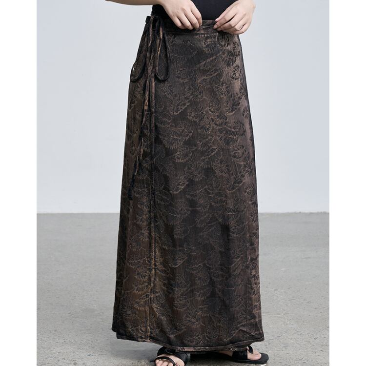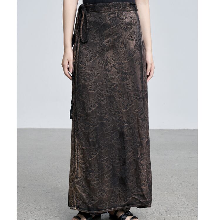 しなやかな光沢と落ち感が魅力の天絲(テンセル)素材を使用した、リーフ柄のラップ風ロングスカート。ゆるやかに広がるAラインシルエットが体型をさりげなくカバーしつつ、足元まで上品に演出します。モード感とナチュラルさを予防した一着で、ブラックトップスやサンダルと合わせれば、洗練された大人のカジュアルスタイルが完成します。