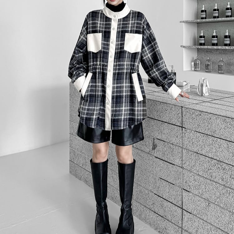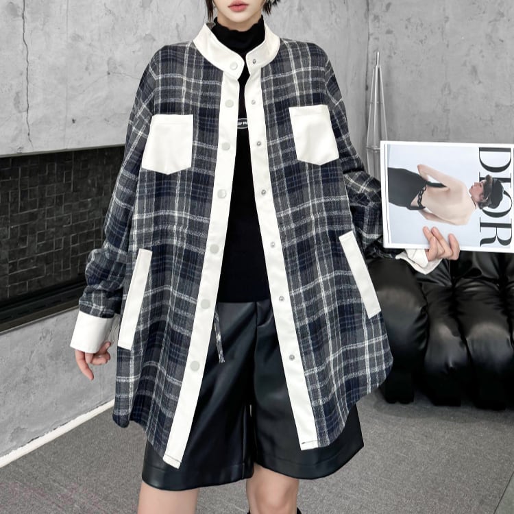 ヨーロッパ調のモードな雰囲気漂うチェック柄×ホワイト切り替えのデザインジャケット。