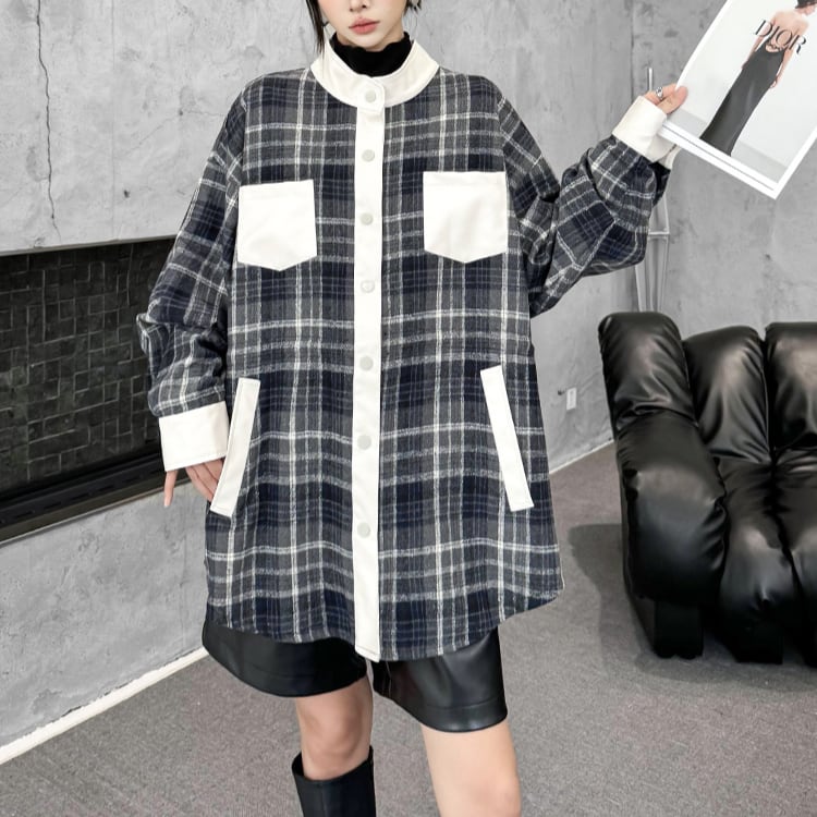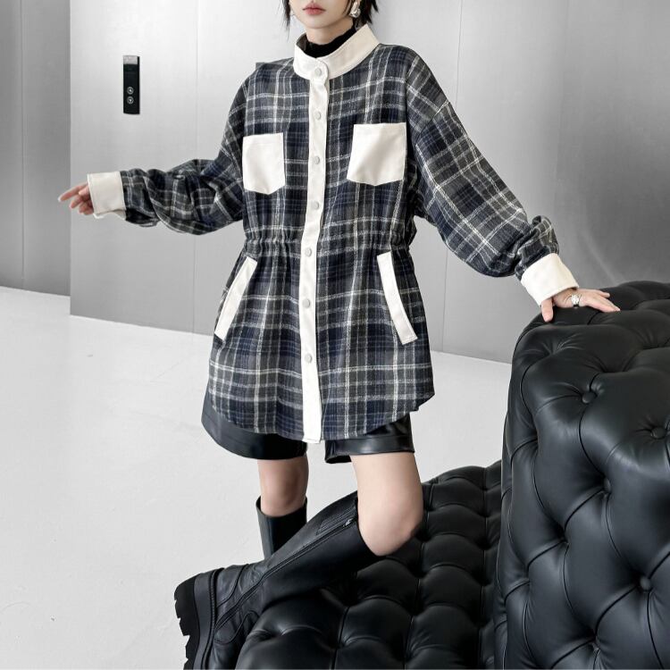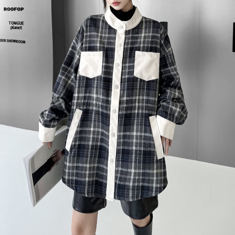 チェック切り替え ウールライクミドル丈ジャケット ◆2col R30022