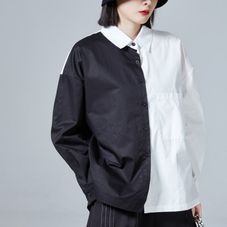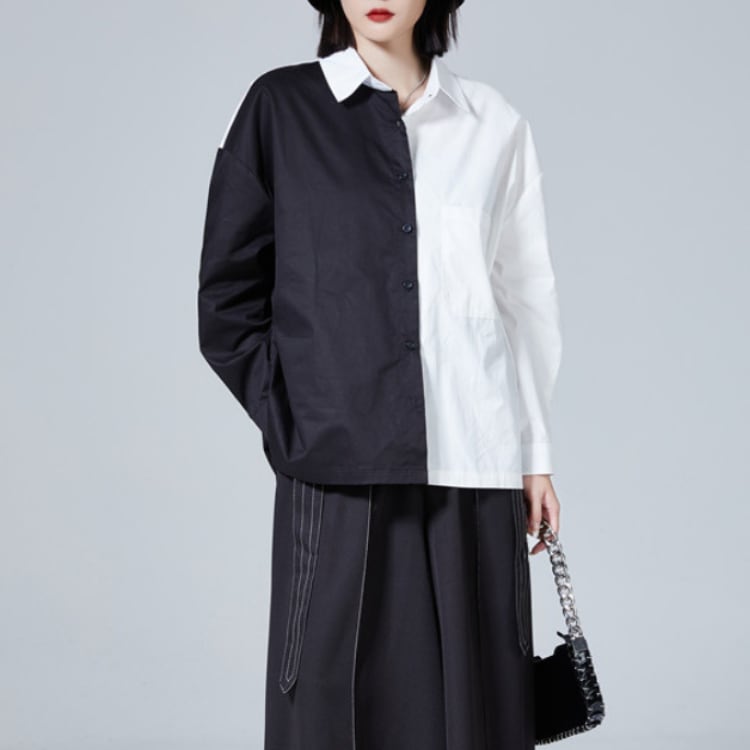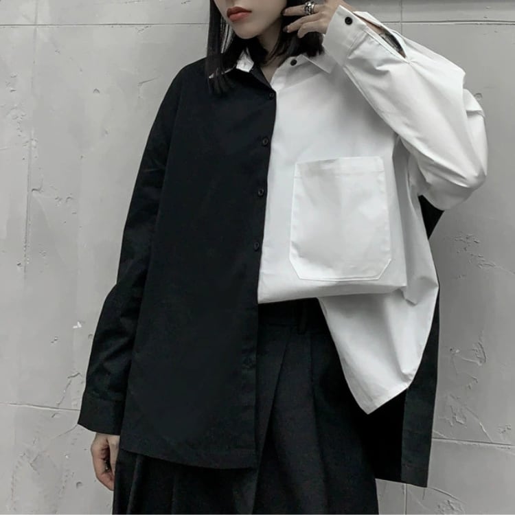 ダークモード系個性派黒白バイカラー長袖シャツユニセックス秋新作 R30006