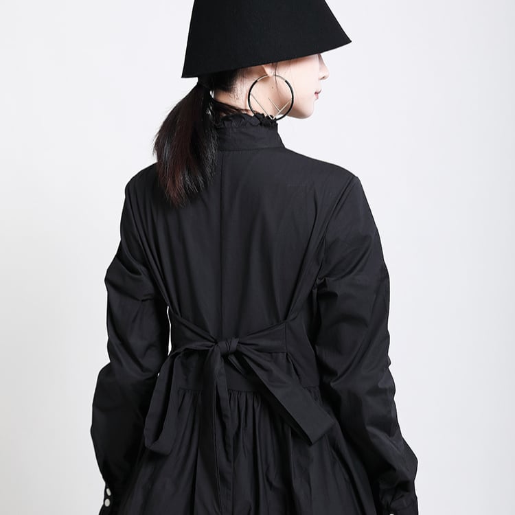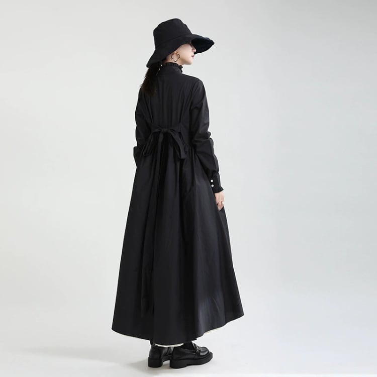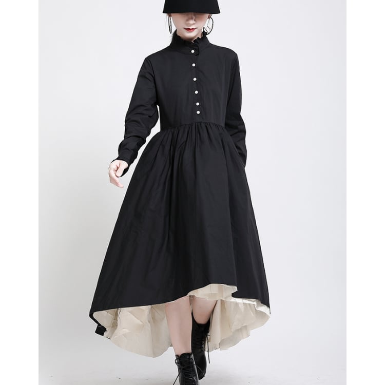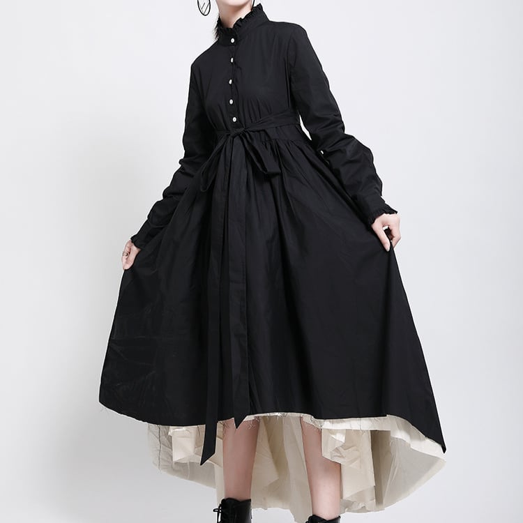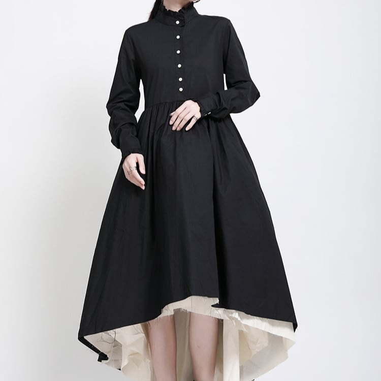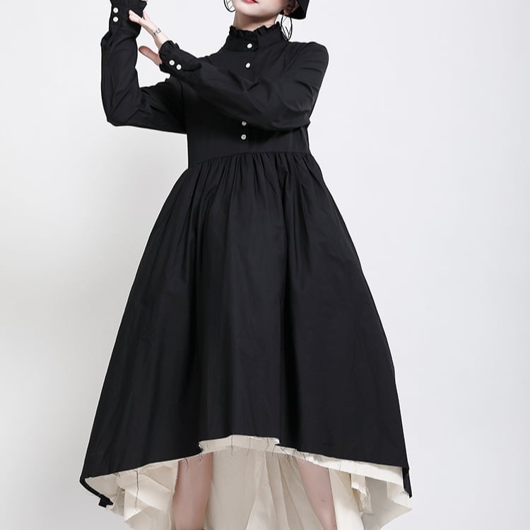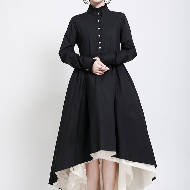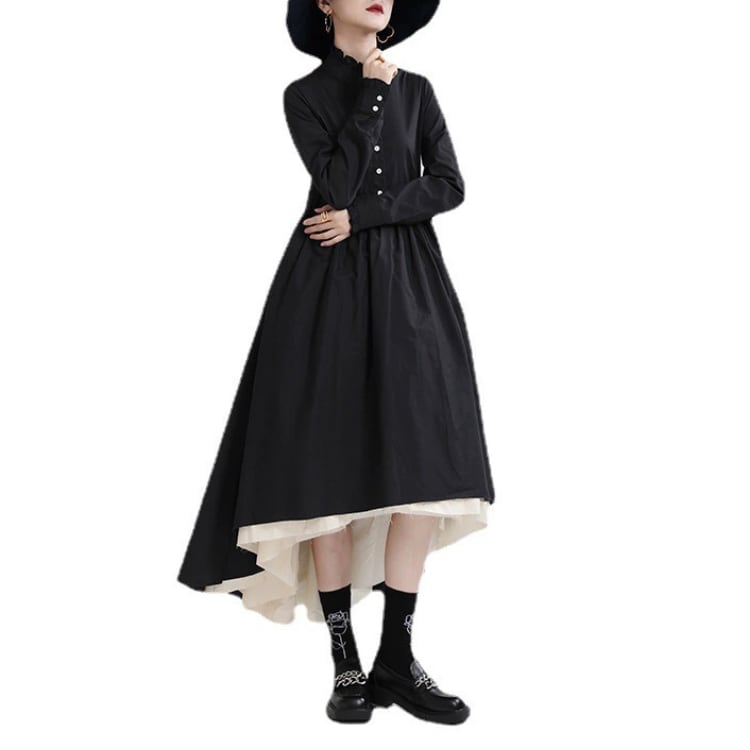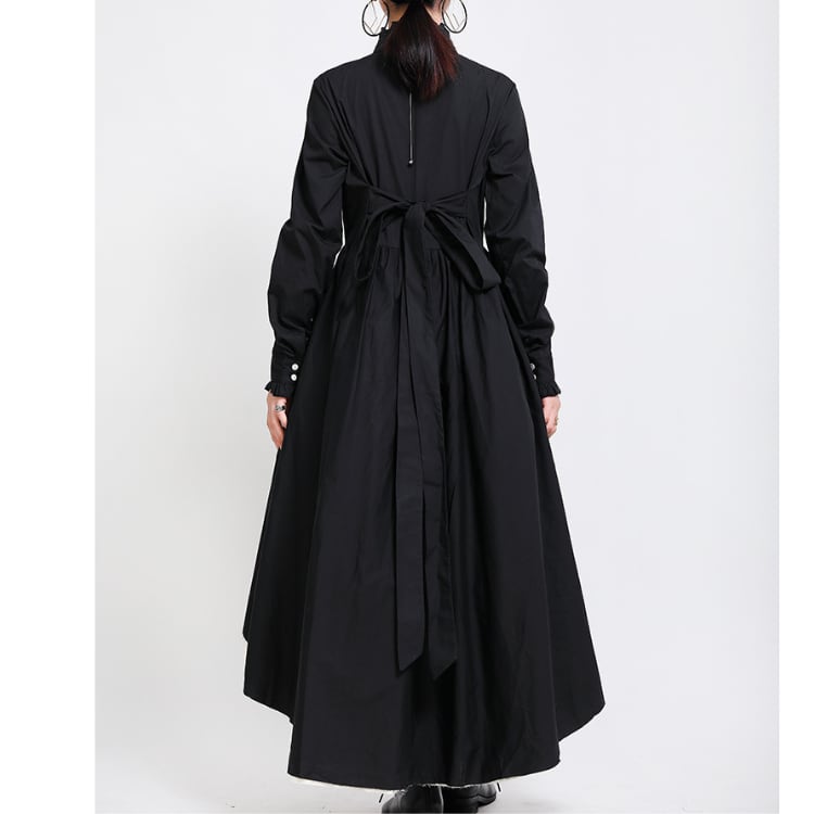 立ち襟デザイン 宮廷風レイヤードワンピース ブラックロングドレス R30008
