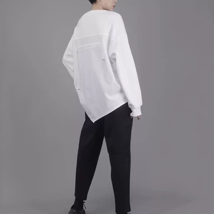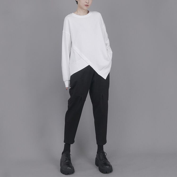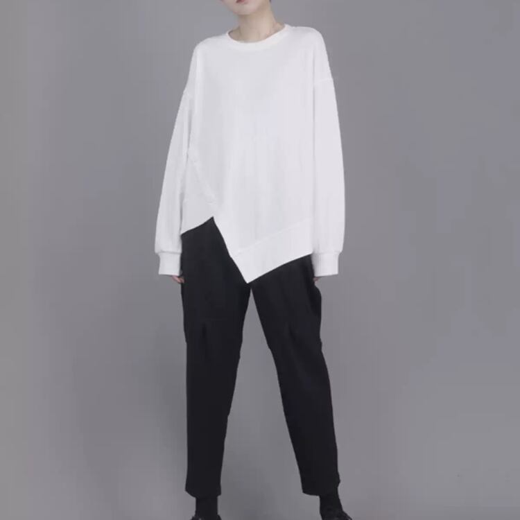 不規則ゆったりカットソー シンプル無地ラウンドネックデザイン長袖トップス R30011