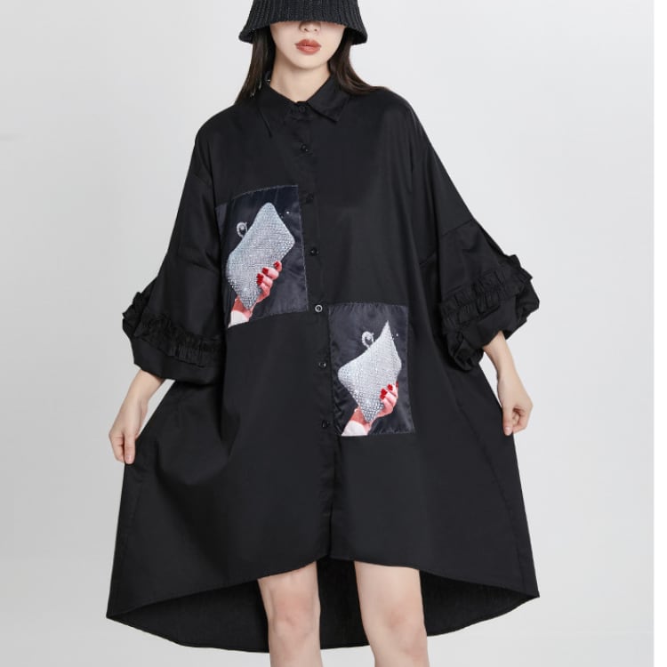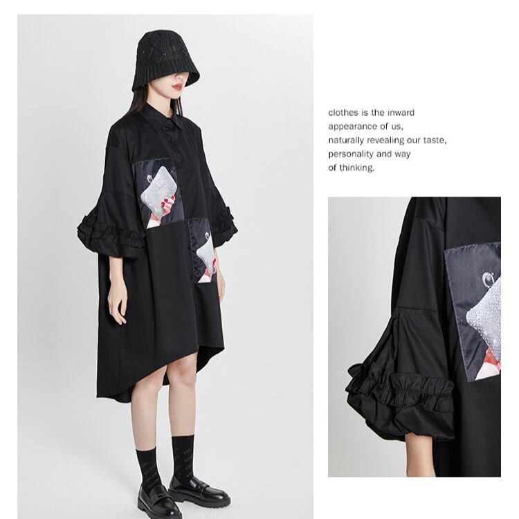 キラキラと輝くビジュー付き貼り布が目を引くシャツワンピース。 ゆったりとしたシルエットと7分丈のバルーンスリーブが、体型をカバーしながらも華やかな印象を与えます。 秋の初めにぴったりの一枚で、カジュアルにも個性派モードにもコーディネート可能です。 大きめのサイズ感で動きやすく、体型を選ばずおしゃれに着こなせます。