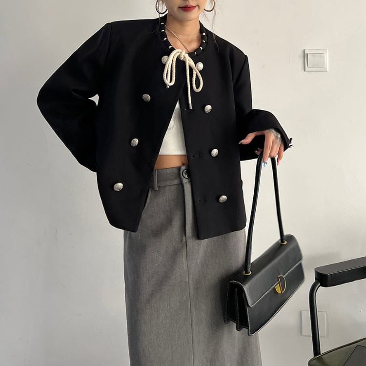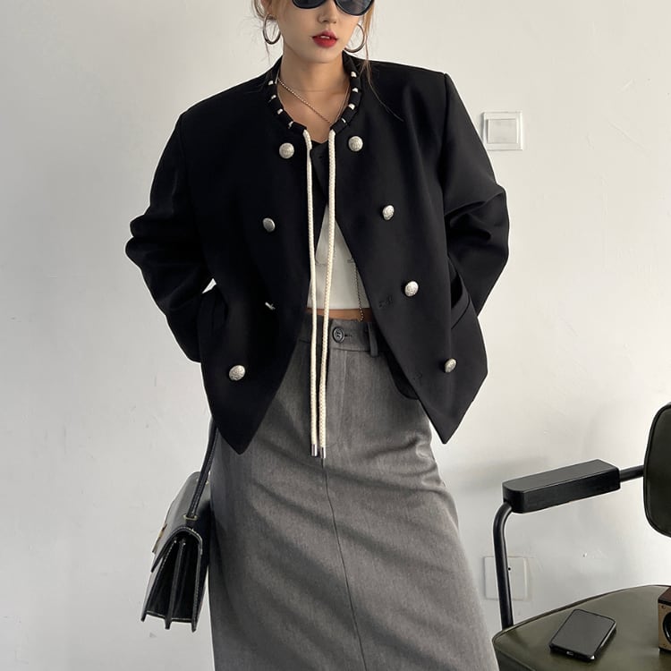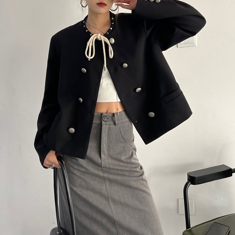 メタルボタンとドローストリングが特徴のショート丈ノーカラージャケットで、小香風の上品さと個性派デザインを兼ね備えたモード感あふれる一枚です。