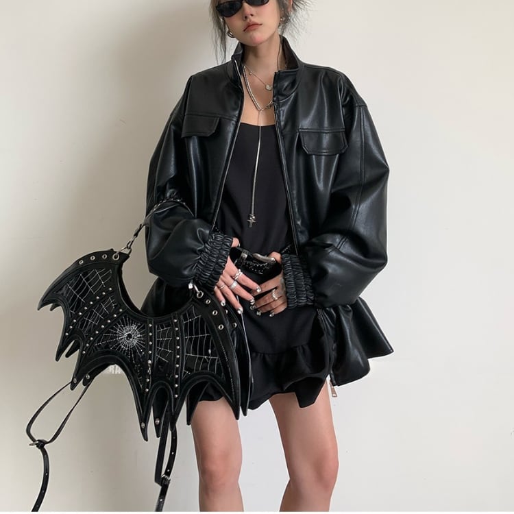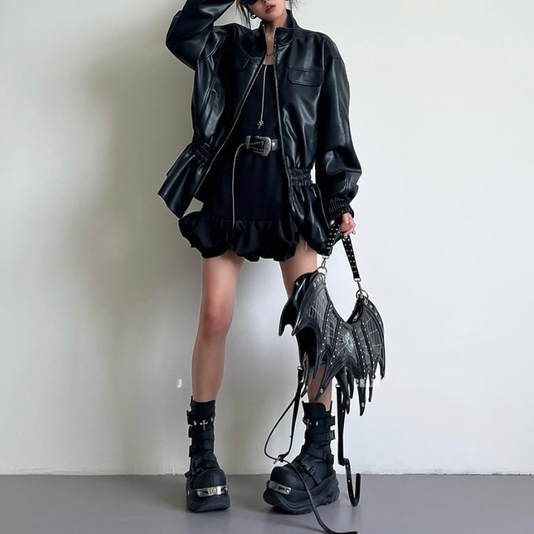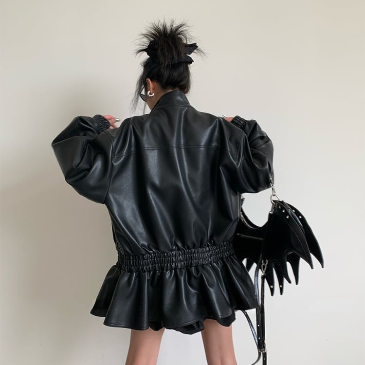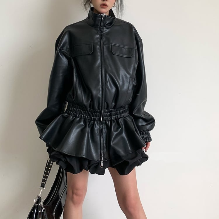 モード系ブラックレザーウエストシェイプフリルヘムジャケット R30039