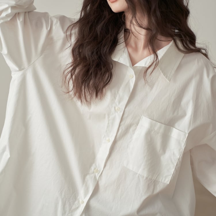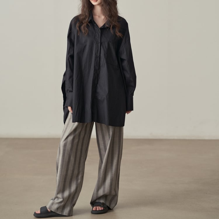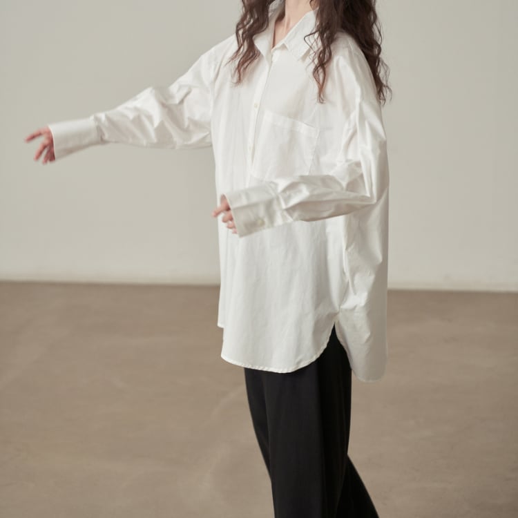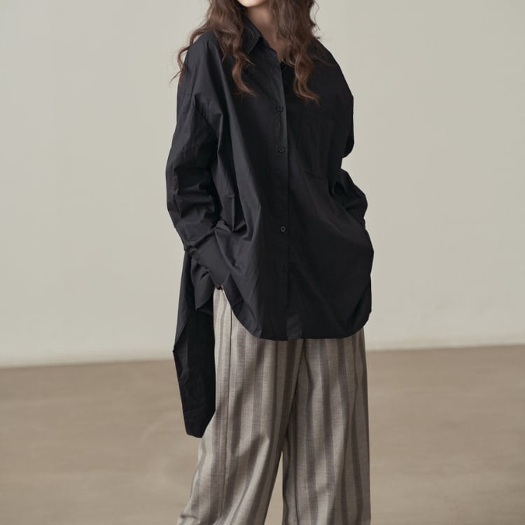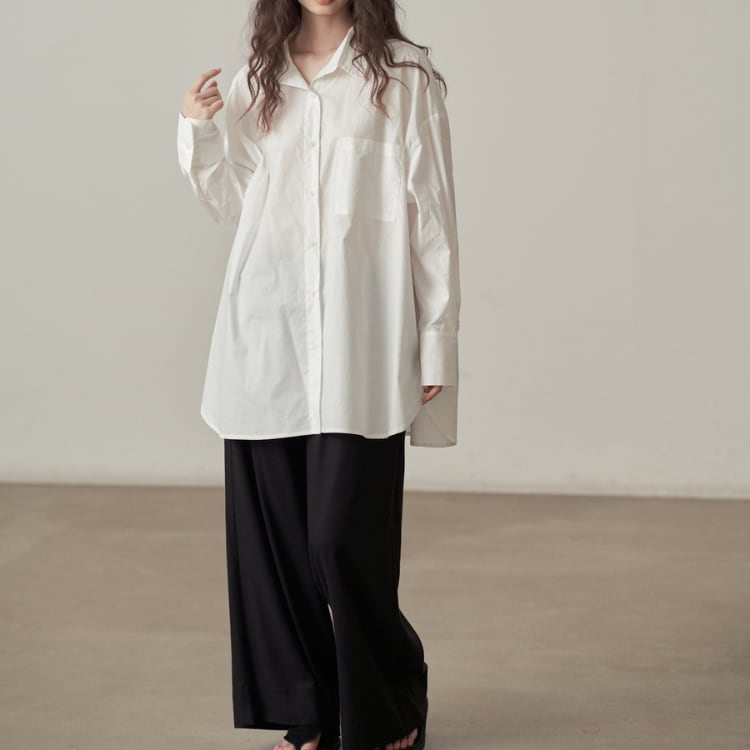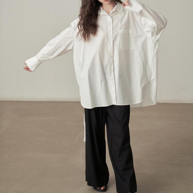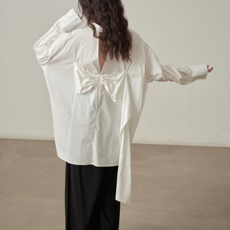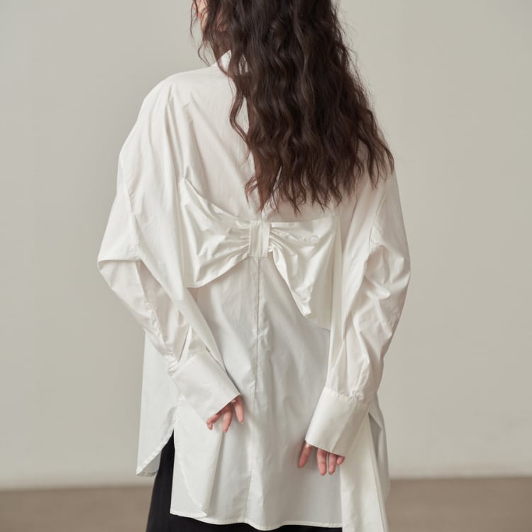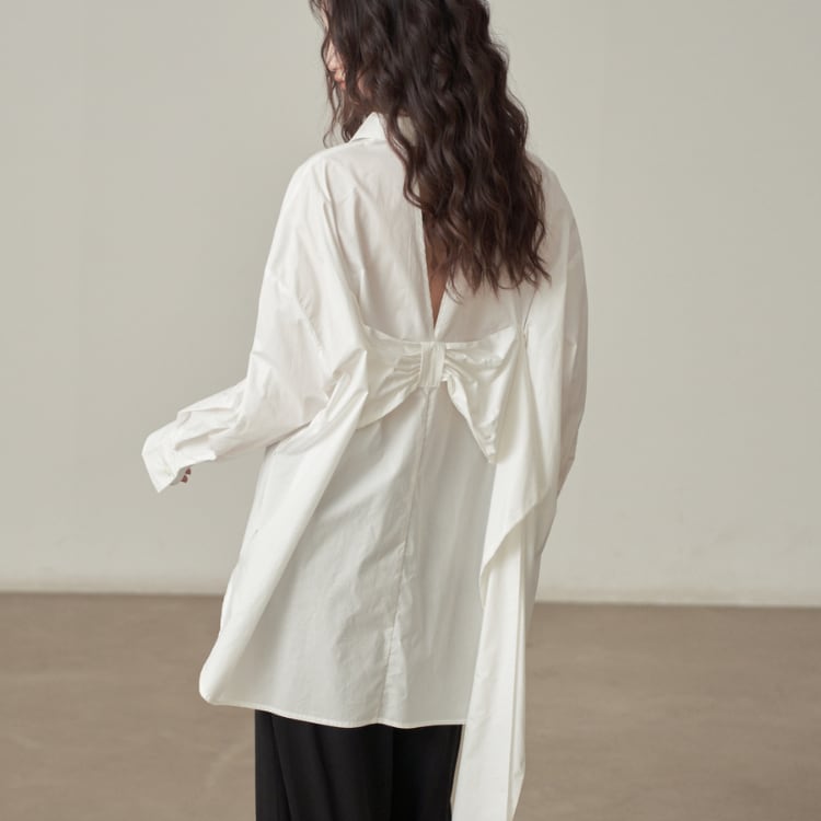 大きなリボンを背中にあしらい、カットアウトで抜け感を演出したロング丈のシャツブラウスは、モード感のあるゆったりとしたシルエットで体型を美しくカバーし、ブラックとホワイトの2色展開で日常から特別なシーンまで幅広く活躍する一枚です。