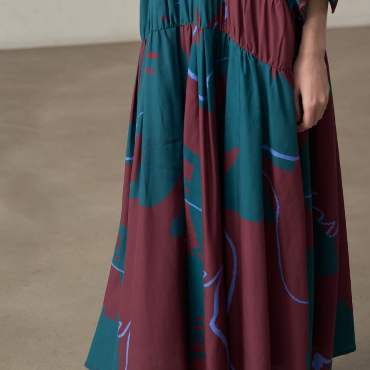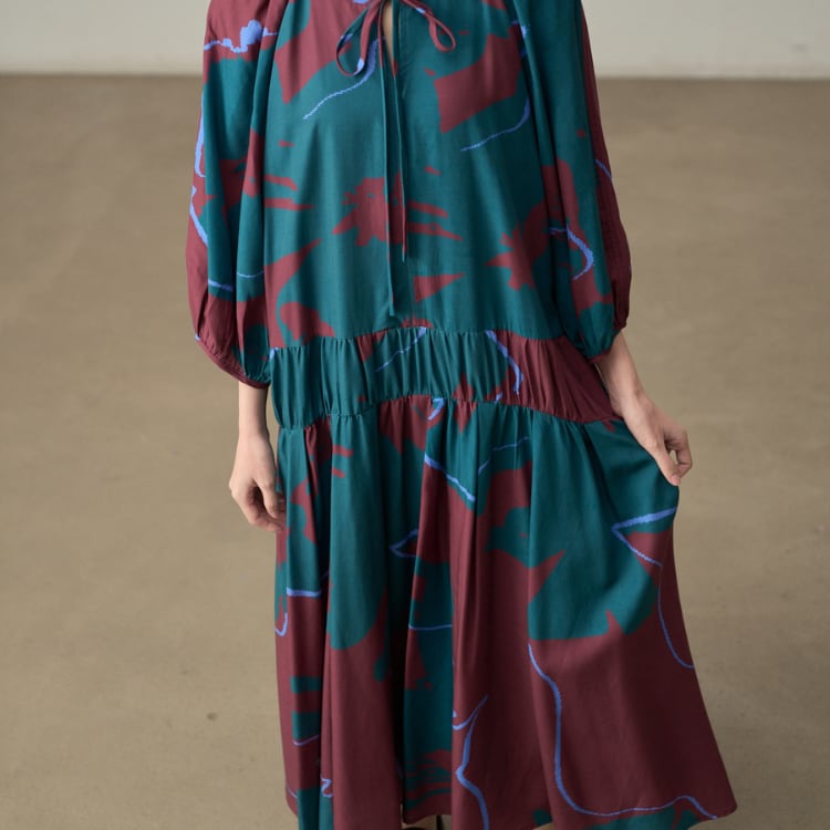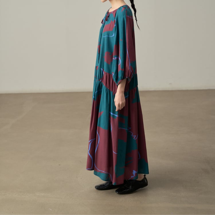 落ち着いた決断のレトロプリントをあしらい、丸首にリボンタイを添えたデザインが上品さを引き立てるロング丈ワンピースは、ゆったりとしたシルエットとウエスト切替でスタイルを美しく見せ、デイリーからリゾート、秋の備えまで幅広く活躍します。