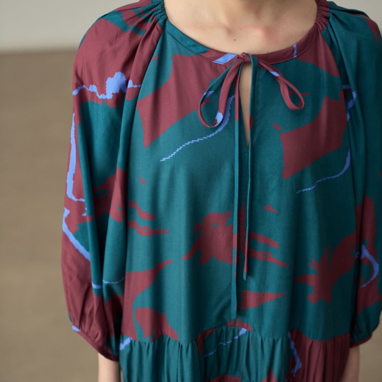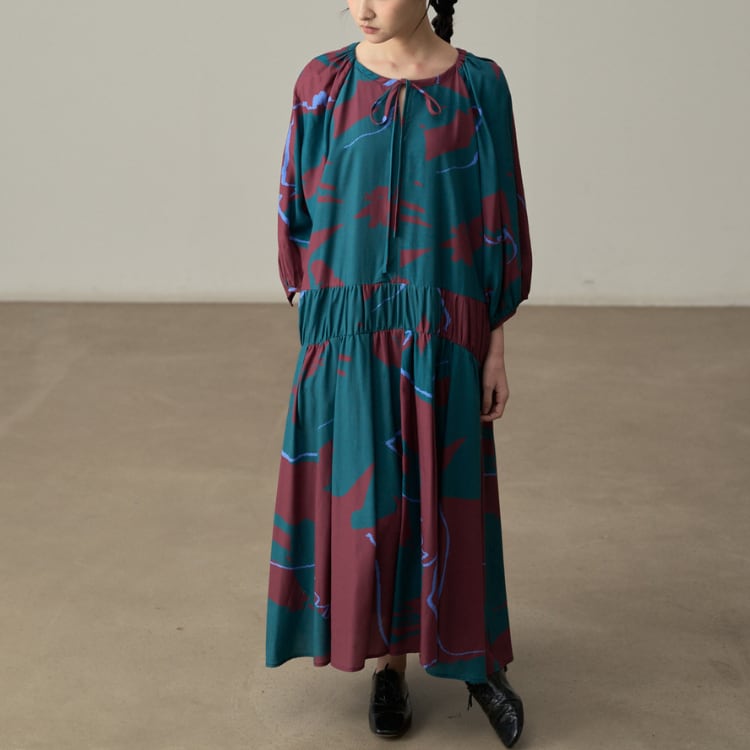 レトロプリント 丸首リボンタイロング丈ワンピース R30060
