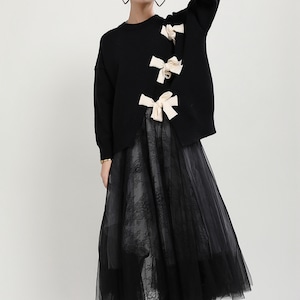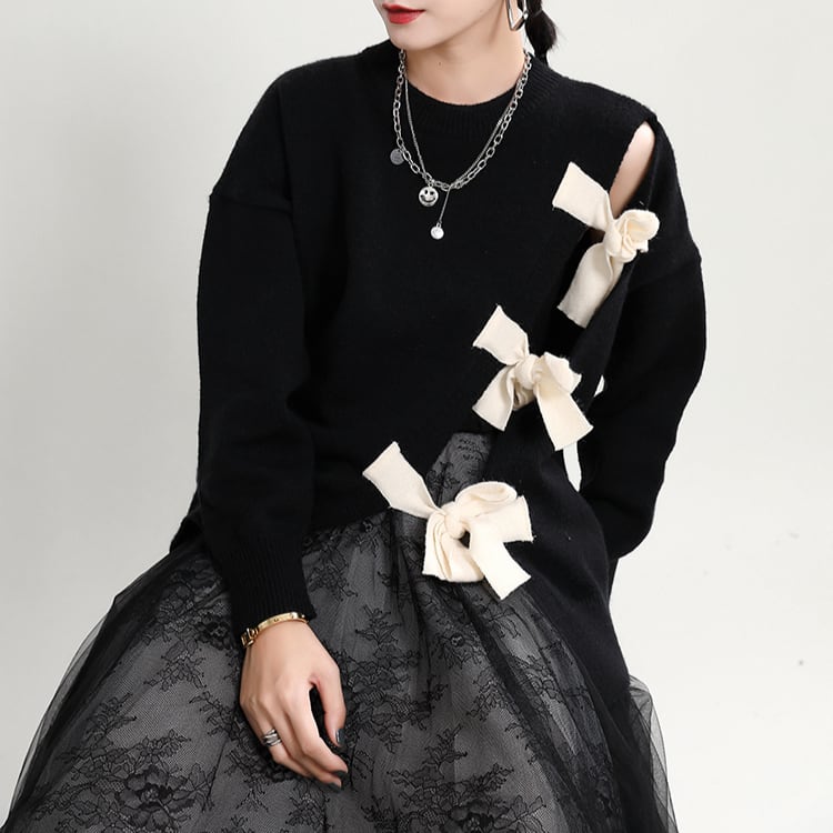 異素材リボンデザインカットアウトニットプルオーバー 斜めに配した思い切ったカットアウトにホワイトリボンを重ねた個性派デザイン、ゆったりとしたシルエットでモード感漂うオシャレなニットトップス