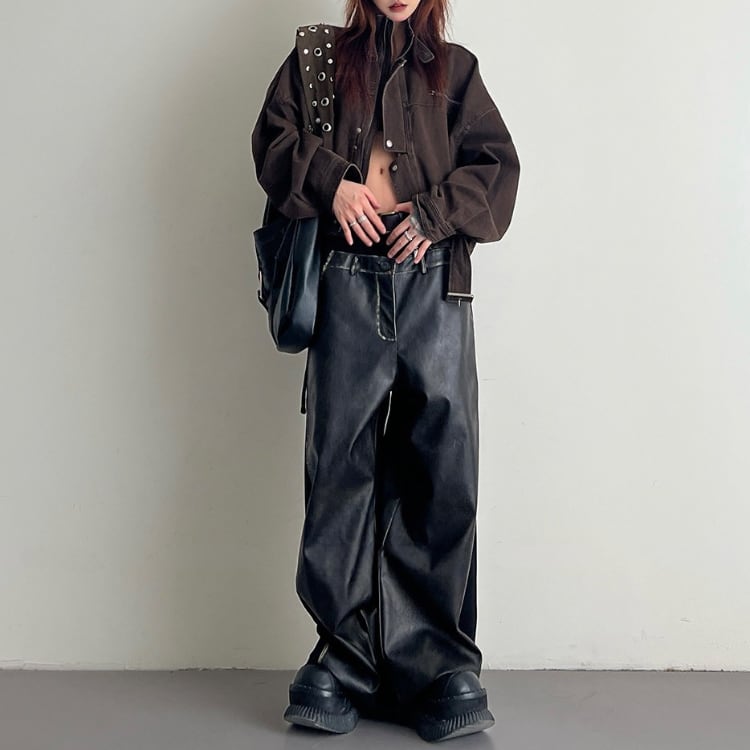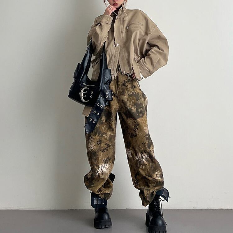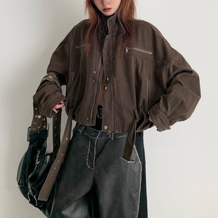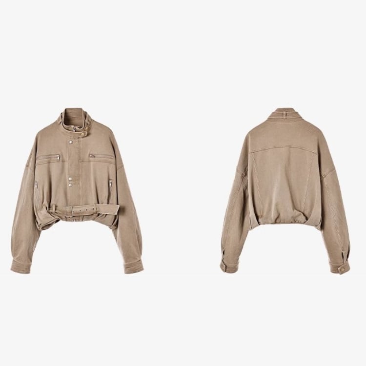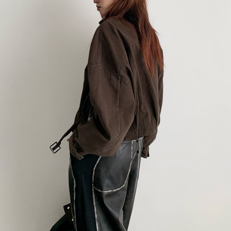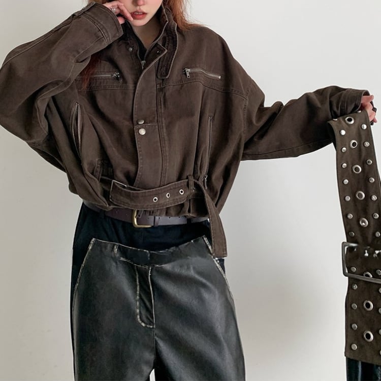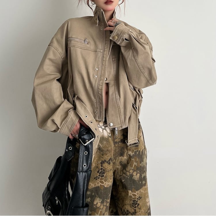 立ち襟ショートと丈のデザインが映えるヴィンテージワーク風ジャケットはゆったりとしたシルエットで演出感を演出し抜けモード感とカジュアルさを守る春秋のスタイリングを格上げする一着です