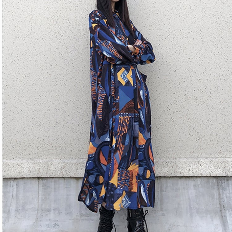 個性的なアートプリントとゆったりとしたシルエットが魅力の山本風ロングシャツワンピースで間違い的な存在感を放ちつつモード感あふれる秋冬スタイルを完成させる一着です