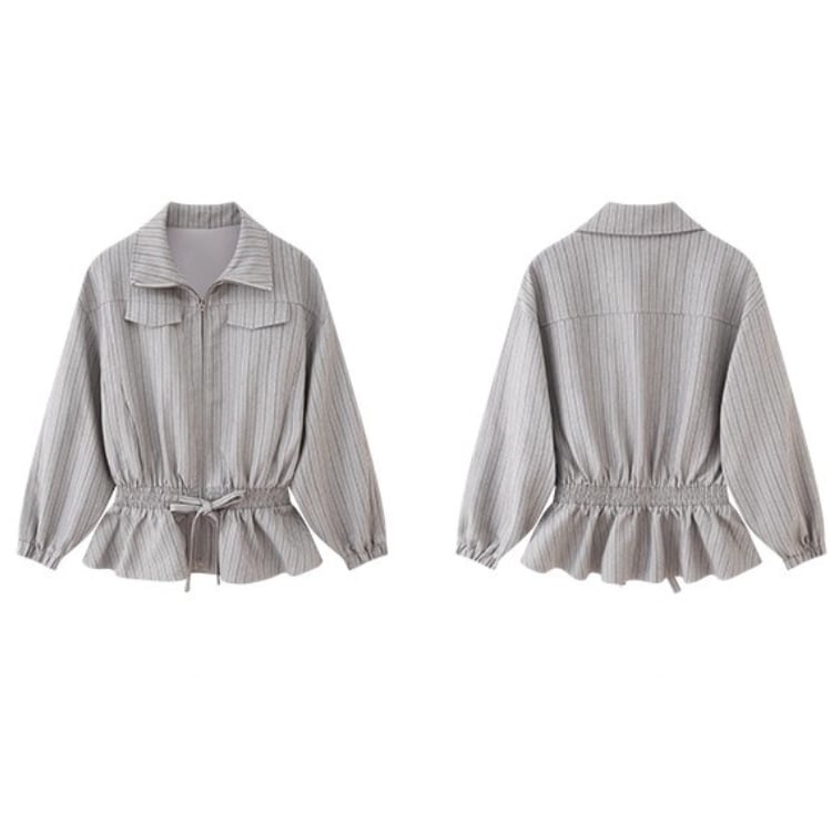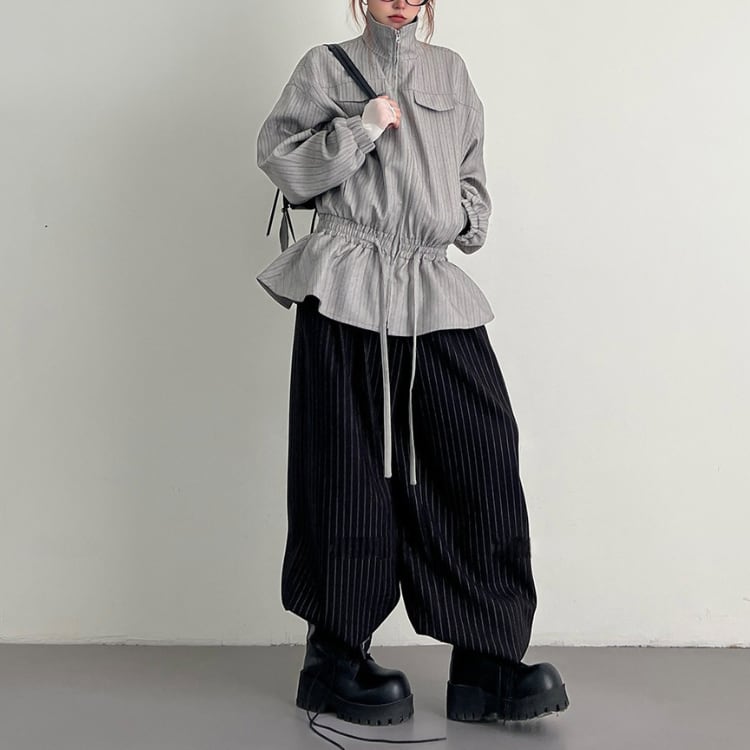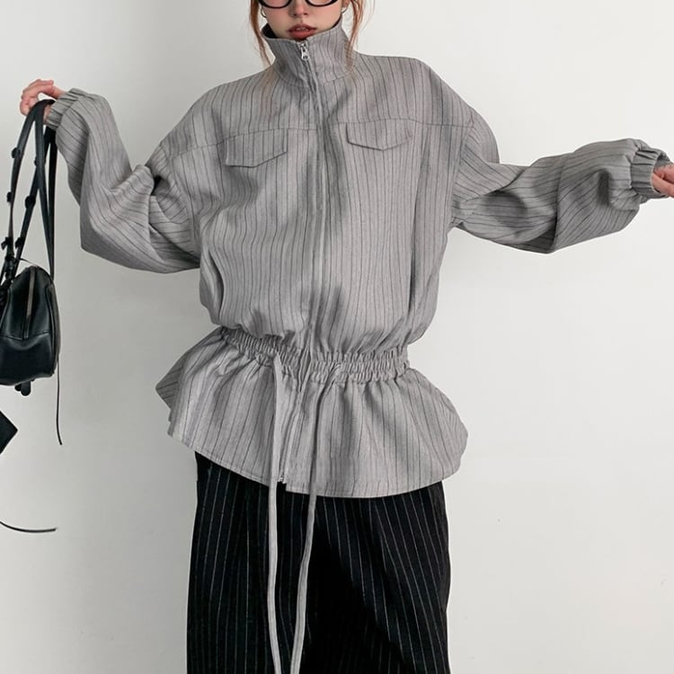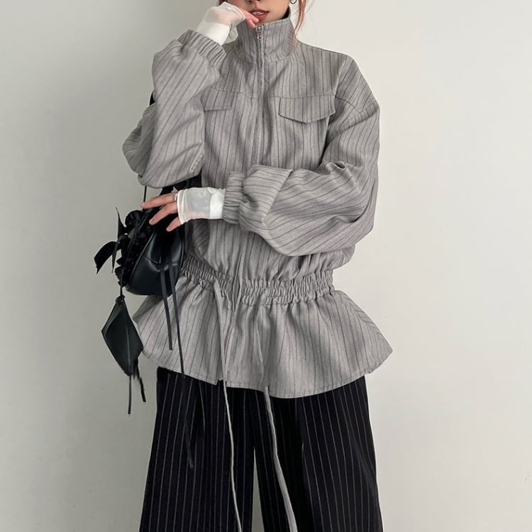 グレーのストライプ地にジップデザインとウエストドロストを抑えた花苞シルエットのジャケットはカジュアルさと上品さを守る春秋のコーデを整える一着です