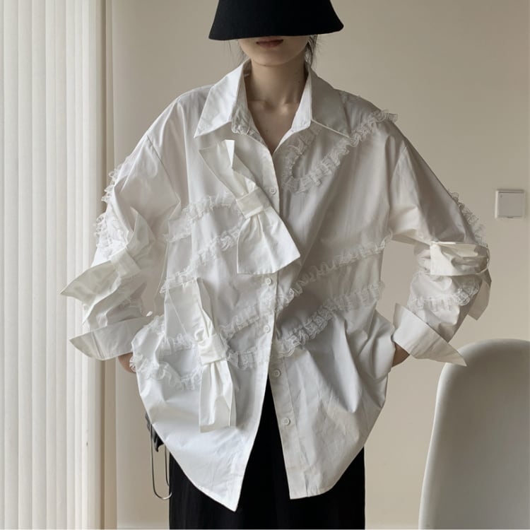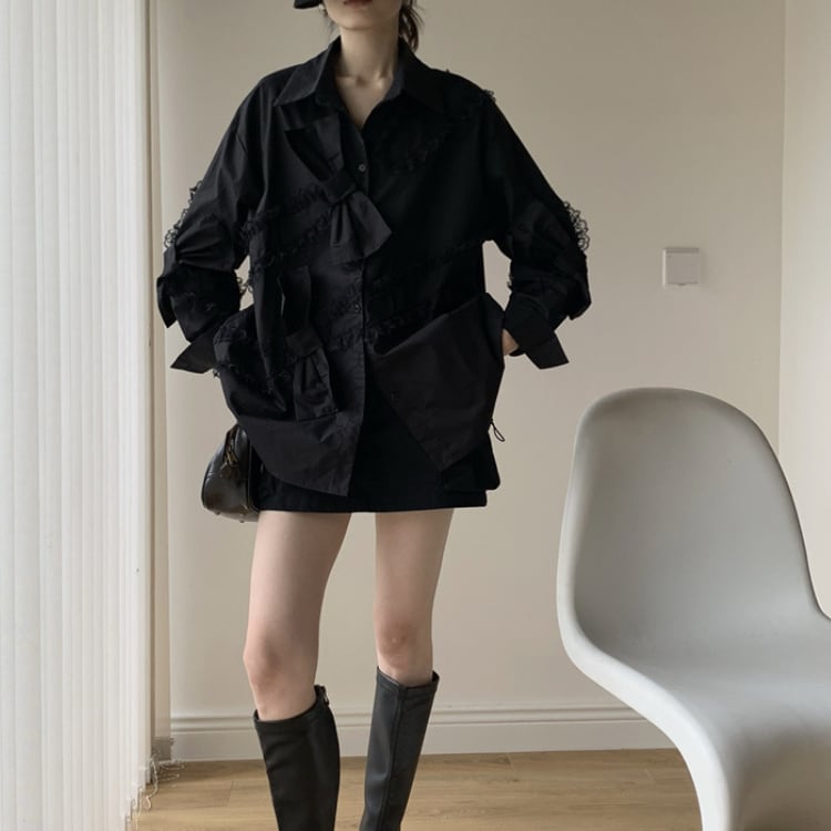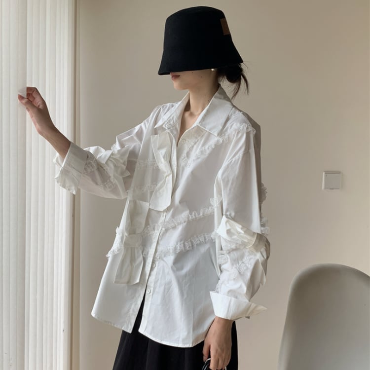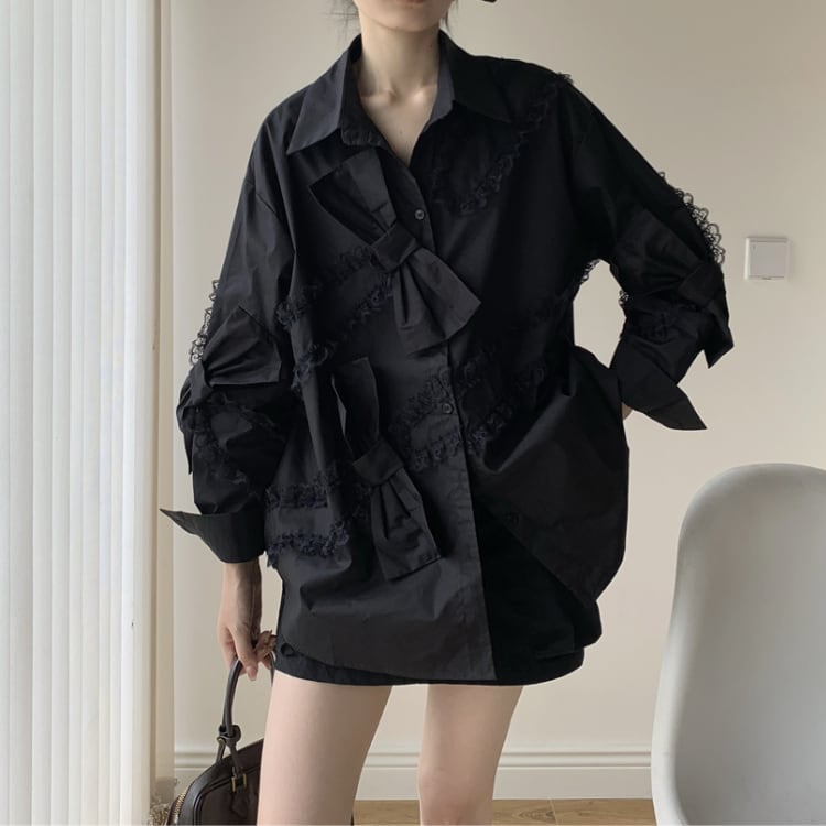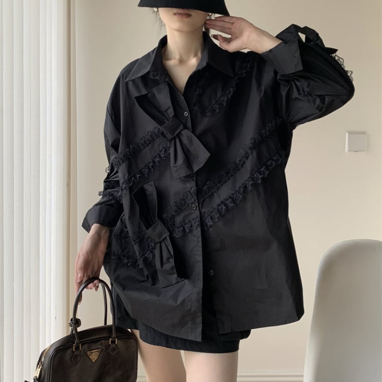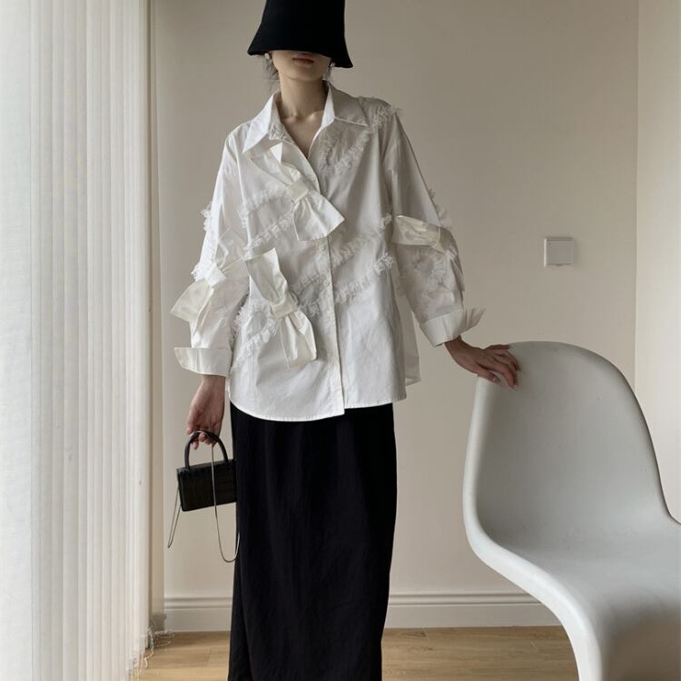 立体的なリボン装飾と繊細なレースを組み合わせたシャツはゆったりとしたシルエットでモード感を放ち存在感のあるスタイルを完成させる秋の個性派ブラウスです