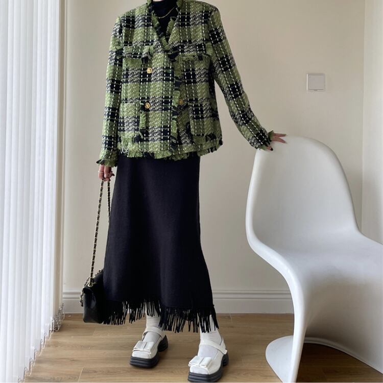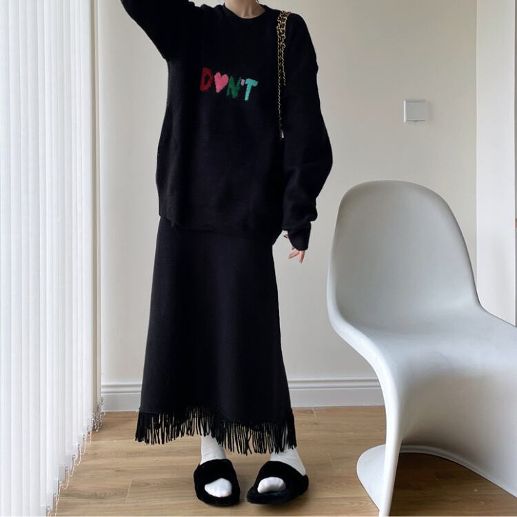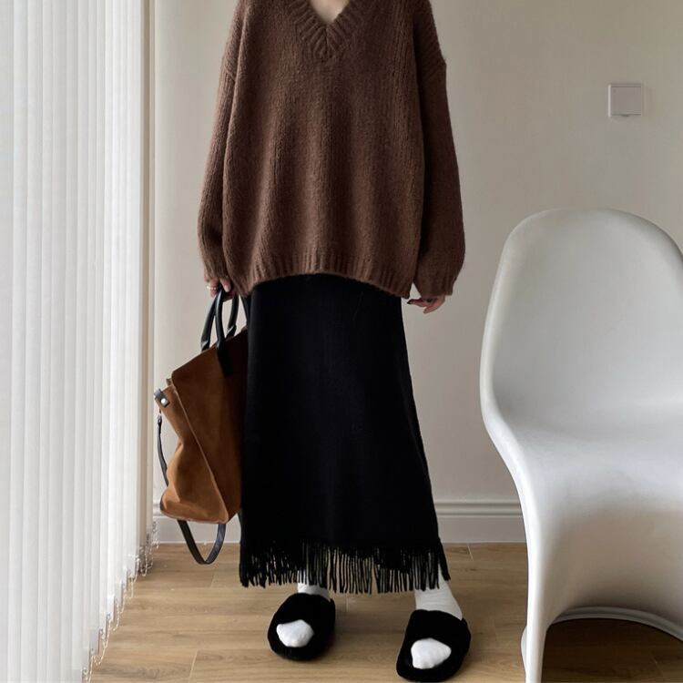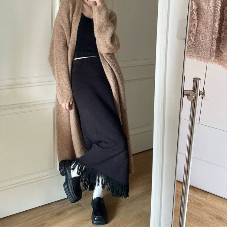 シンプルなブラックニットにフリンジをあしらったロングスカートは高めのウエスト位置で脚長効果を演出し上品さと抜け感を大切に秋冬コーデを整える一着です