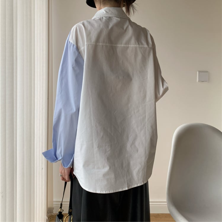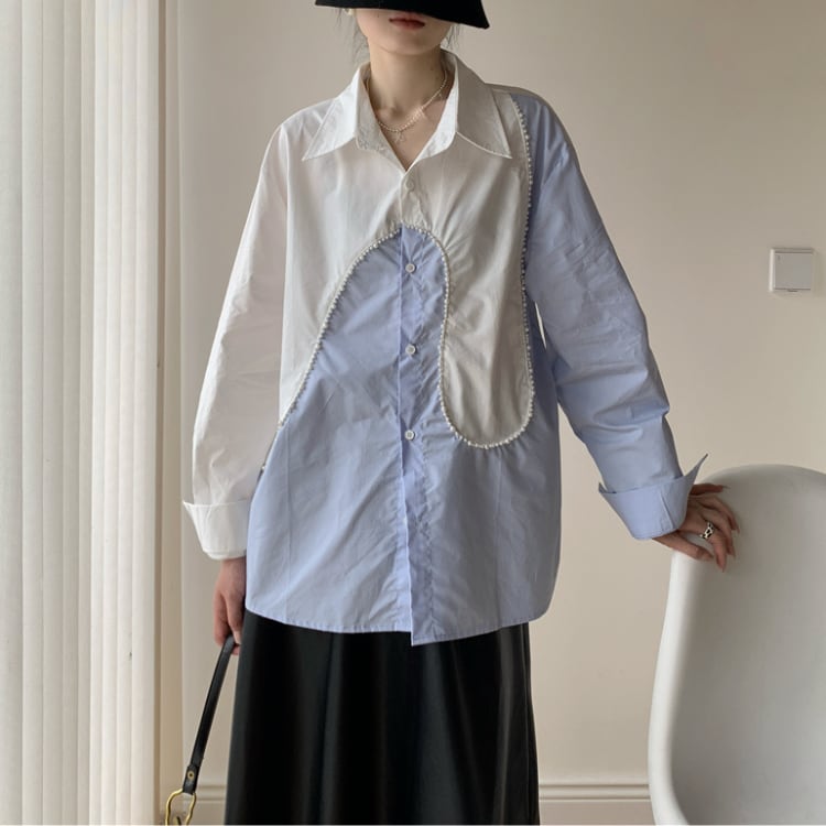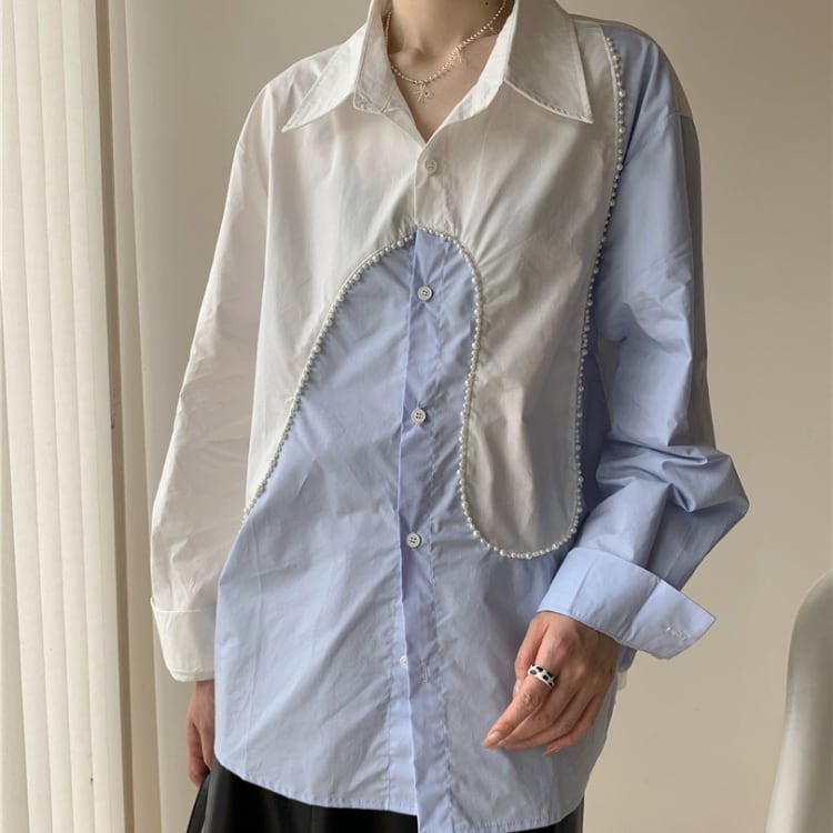 パール装飾アシンメトリーデザイン切り替えシャツ ブラウス ◆2col R30057
