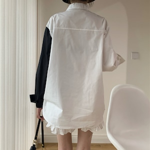 大胆な異素材切り替えに沿って施されたパール装飾が華やかさを添えるアシンメトリーデザインシャツはシルエットを引き締めモード感と個性を抑えた主役級トップスです