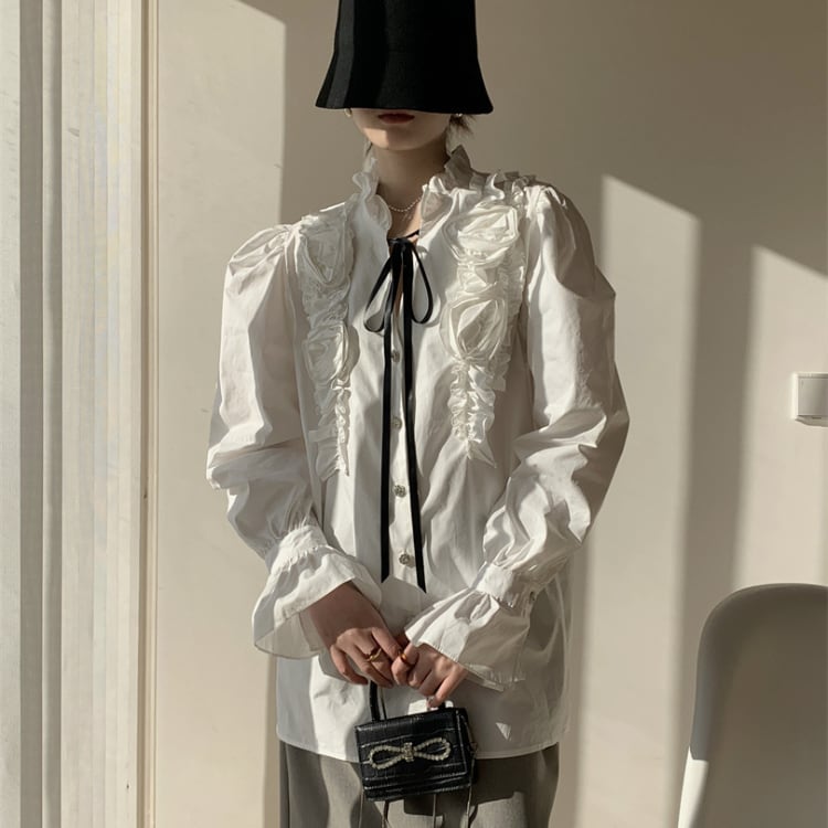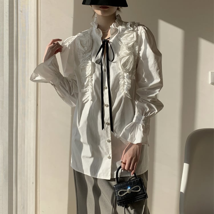 胸元にあしらわれた立体的なローズ装飾とふんわり膨らむスリーブが華やかさを演出しシャツワンピ風に着こなせるエレガントなデザインブラウスです