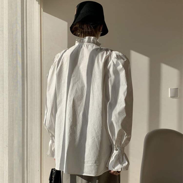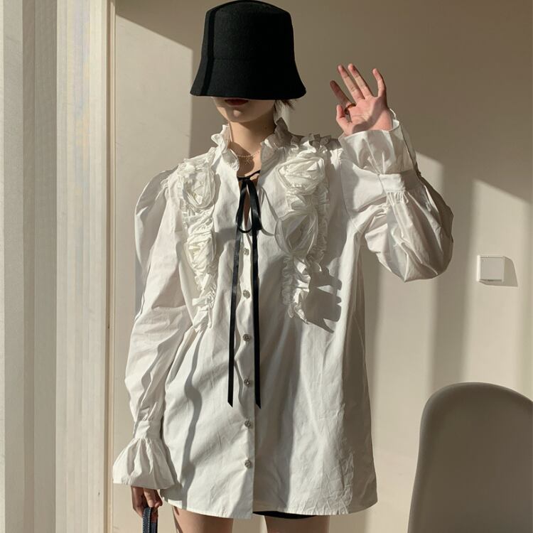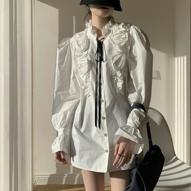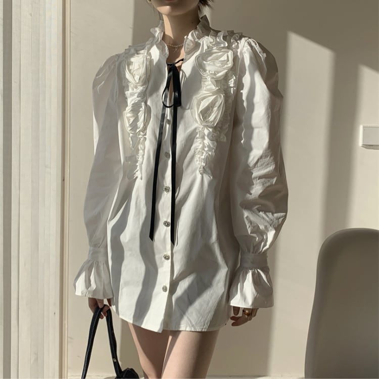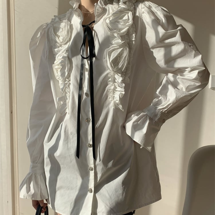 立体ローズ装飾ボリュームスリーブシャツワンピ風ブラウス R30064