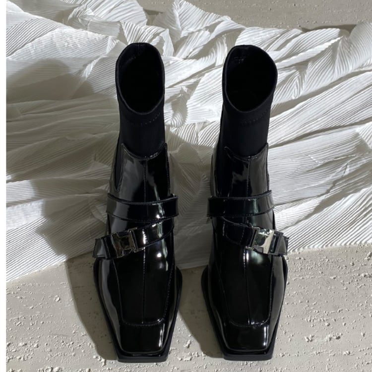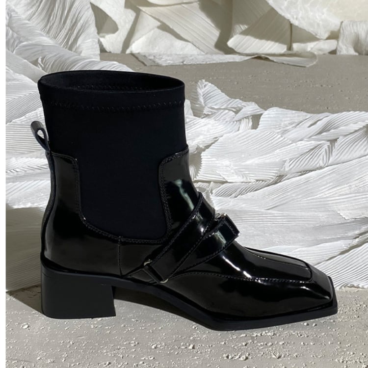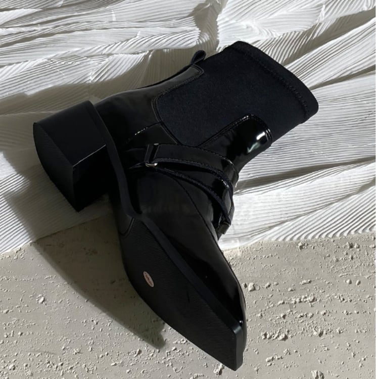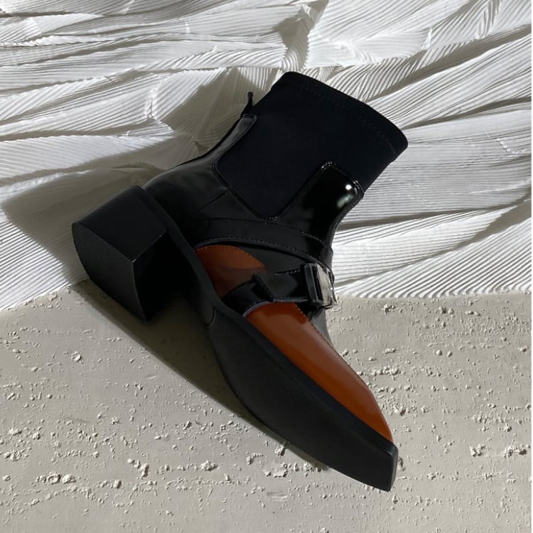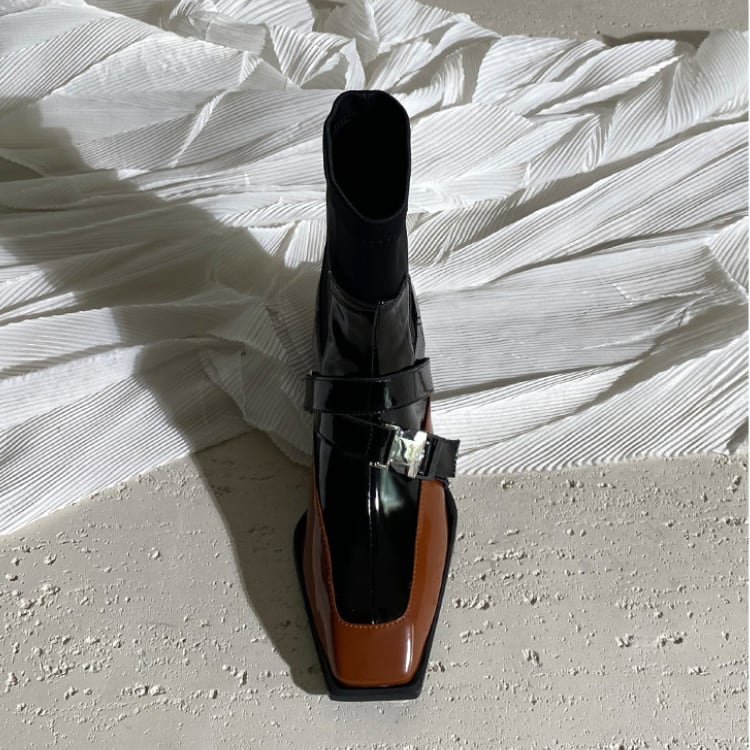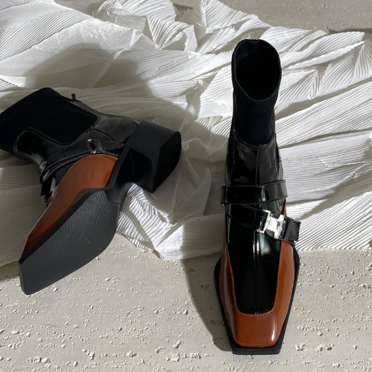 個性派デザインが定めるスクエアトゥのチェルシーショートブーツはバイカラー切替とメタルバックルがアクセントになり洗練されたモード感を放つ一足です