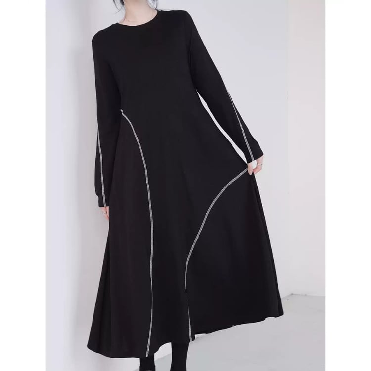 シンプルなブラックワンピースに、コントラストのついたステッチラインを実施したデザイン。 ゆったりとしたAラインシルエットが体型をさりげなくカバーし、動きにも合わせて美しいシーズンを演出します。 長袖仕様で秋冬シーズンに最適、インナー使いの一枚着にも映える万能アイテム。