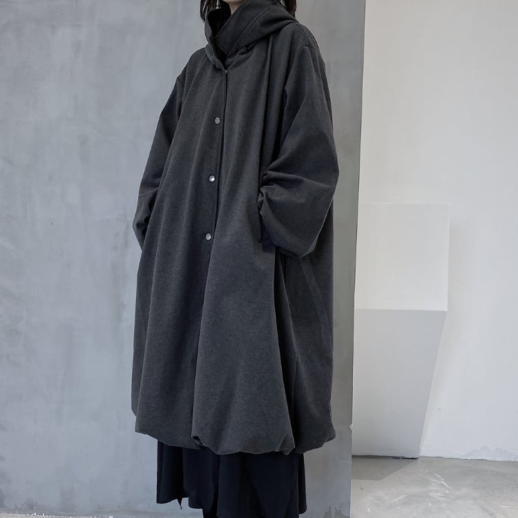 ゆったりとしたシルエットが魅力の厚手のハンドフード付きコート。 保温性に優れた生地を使用し、秋冬の防寒アウターとして活躍します。