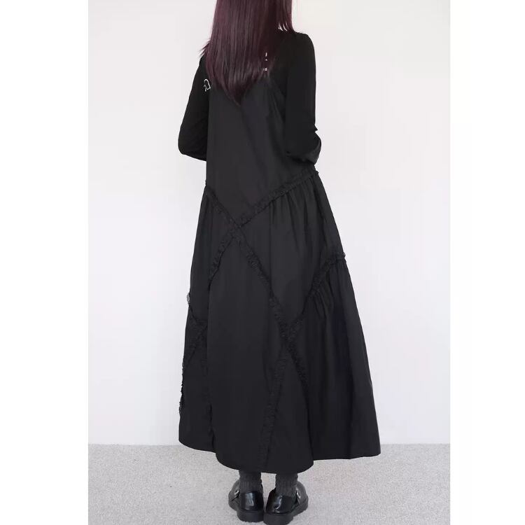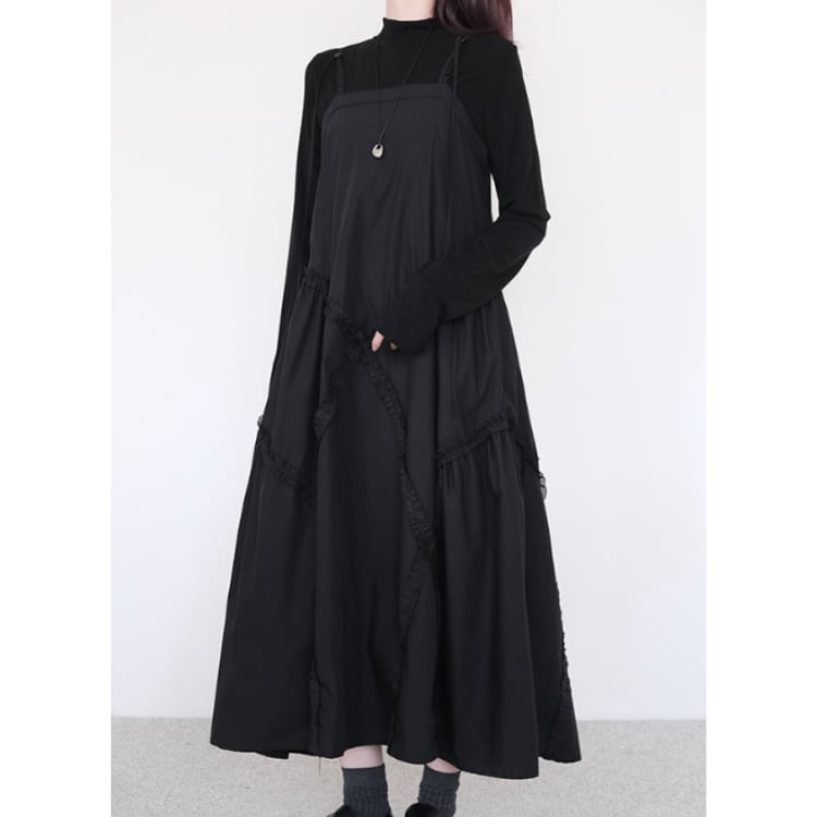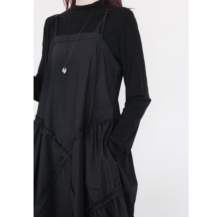 シンプルなブラックをベースに、個性を生かすアシンメトリーな切り替えデザインが印象的なキャミワンピース。 ボディラインを拾わないゆったりとしたシルエットでありながら、計算された切り替えとフリル使いが立体感を生み、動くたびに表情を変える一着です